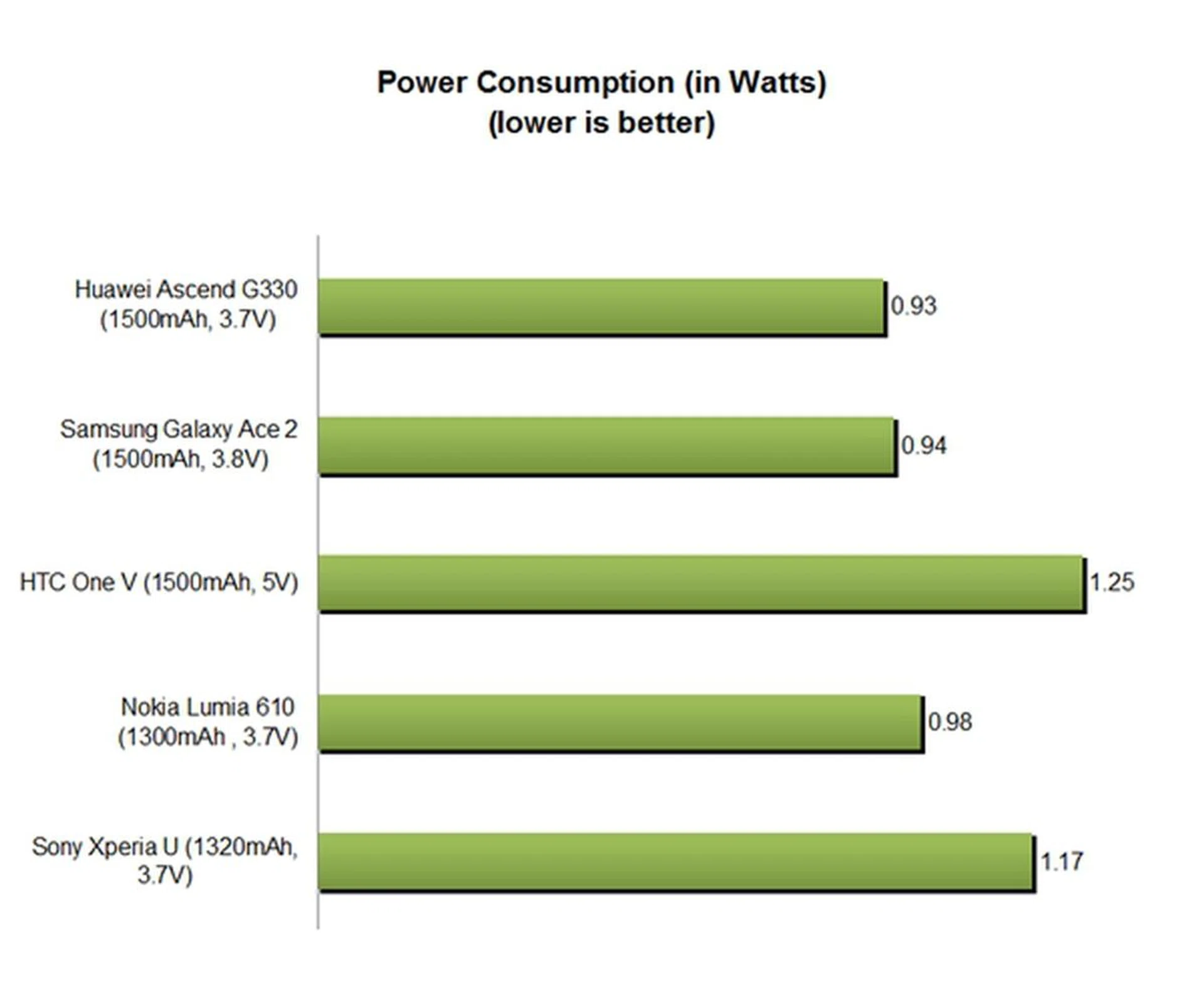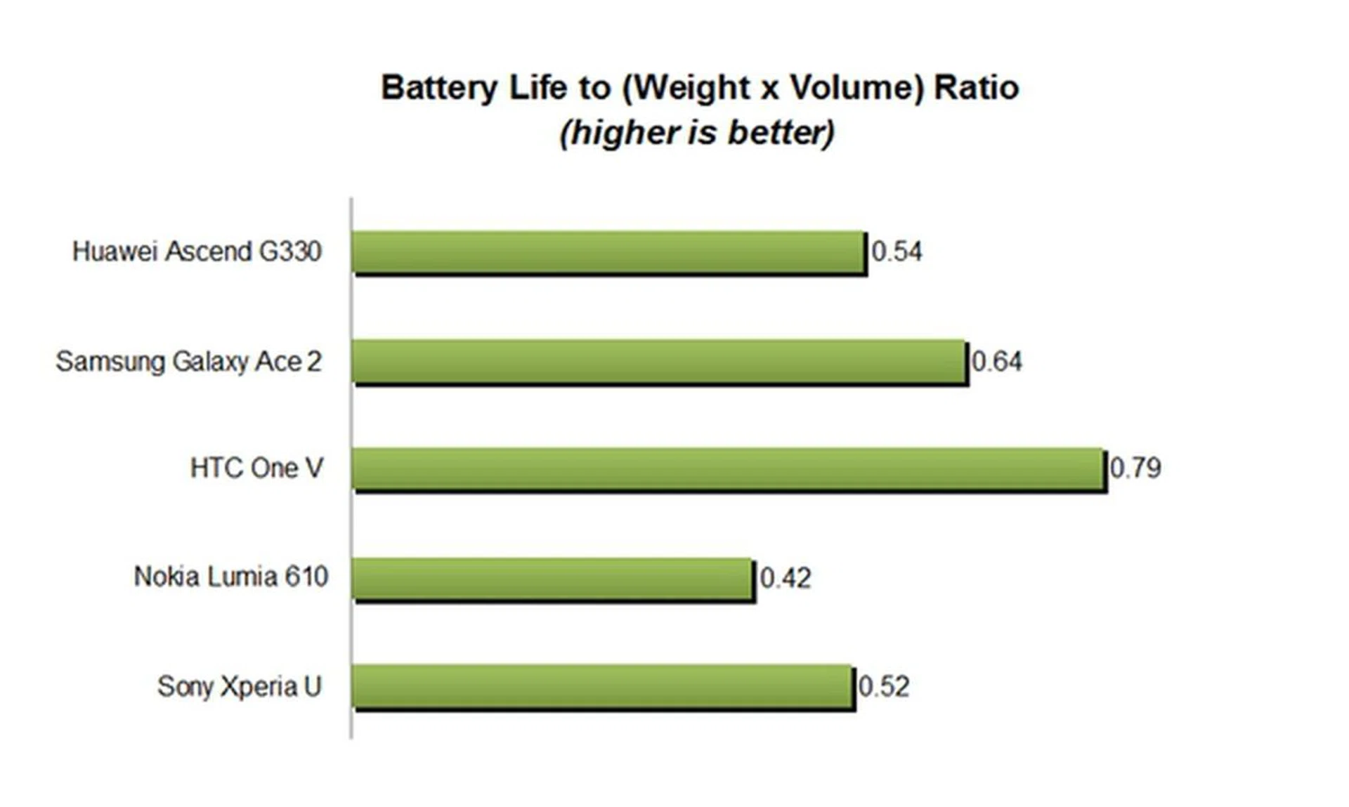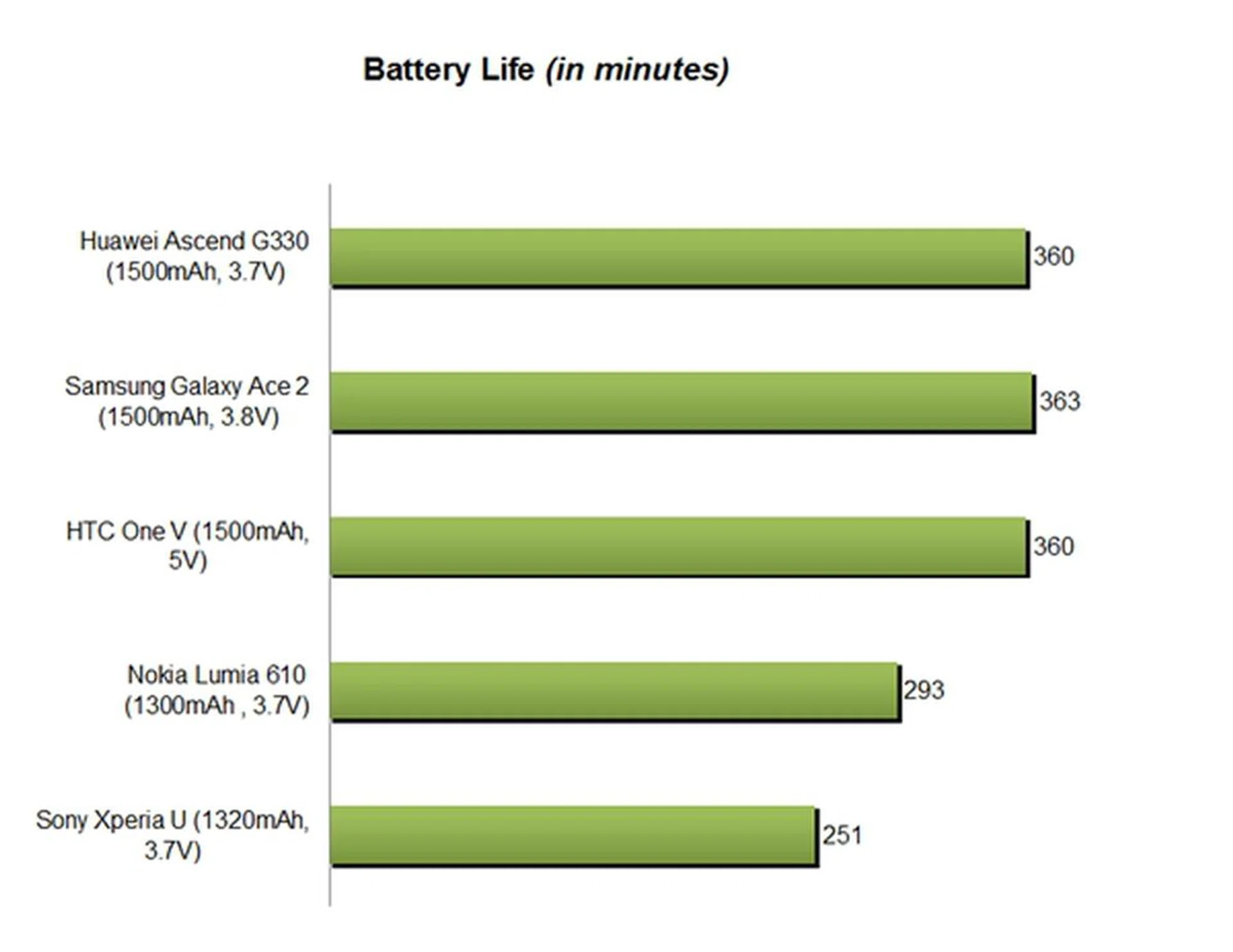 The Huawei Ascend G330 ties in with the HTC One V at 360 minutes of battery life - with Samsung Galaxy Ace 2 taking the top spot. However, because the Huawei Ascend G330 is the second heaviest in the group, it goes down to third place in terms of portability ratio, losing the first place and second place to 115g HTC One V and 122g Samsung Galaxy Ace 2 respectively.