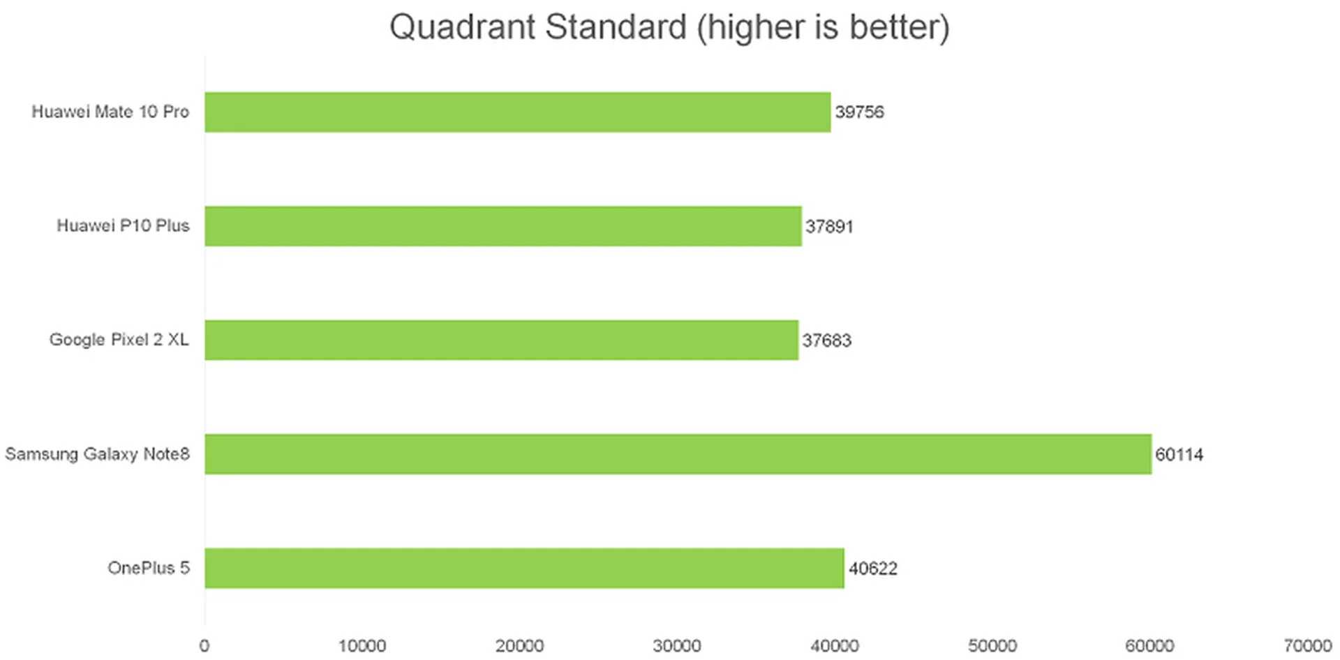 Quadrant is an Android benchmark that evaluates a device's CPU, memory, I/O and 3D graphics performances. The Mate 10 Pro performed reasonably well in this benchmark, beating the Google Pixel 2 XL but losing to both the OnePlus 5 and to the untouchable Galaxy Note8.