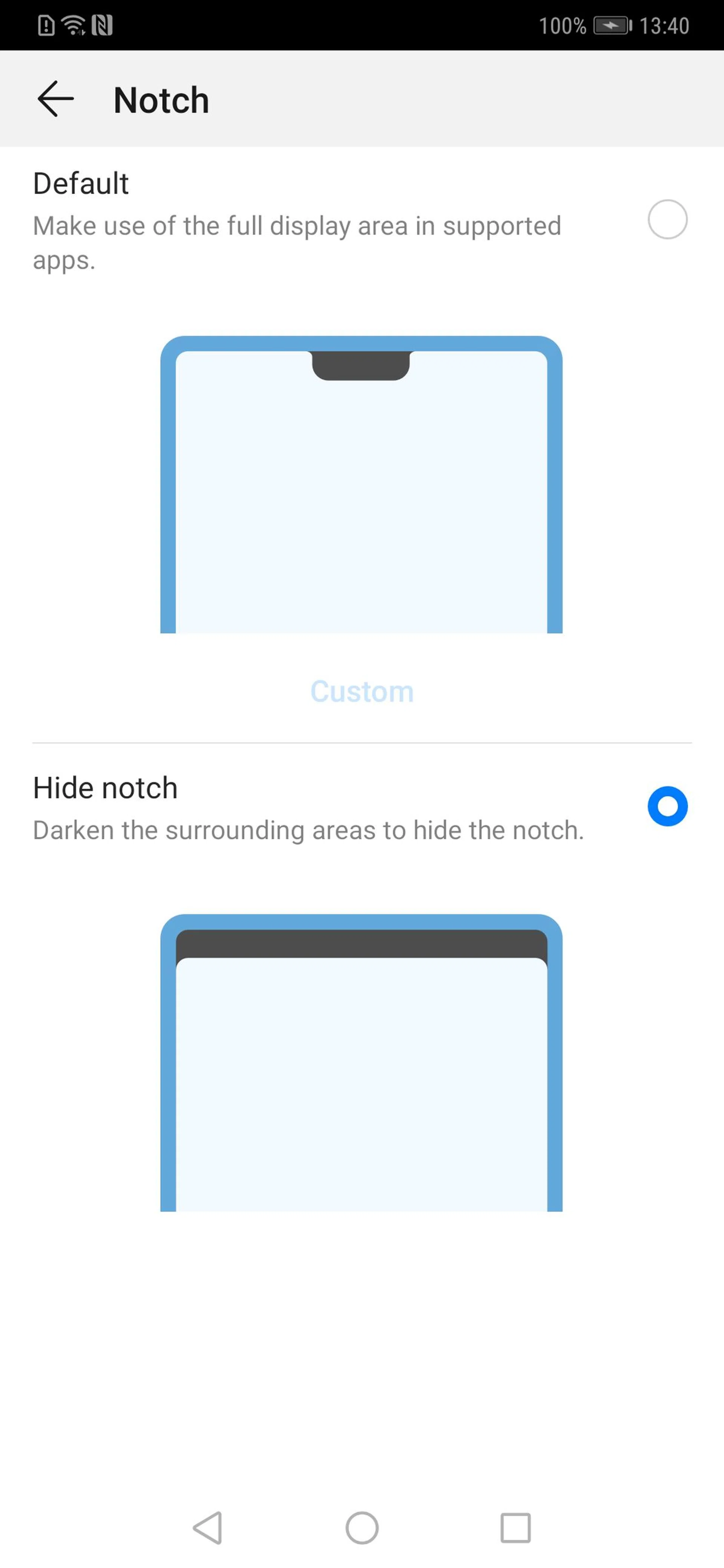 The notch in the display is about the same as the one you'll find on the iPhone XS - which is to say, it's quite large. If you hate notches, you can hide it with an effect that turns the sides black, while still letting you display information like the clock, signal strength and battery life there.