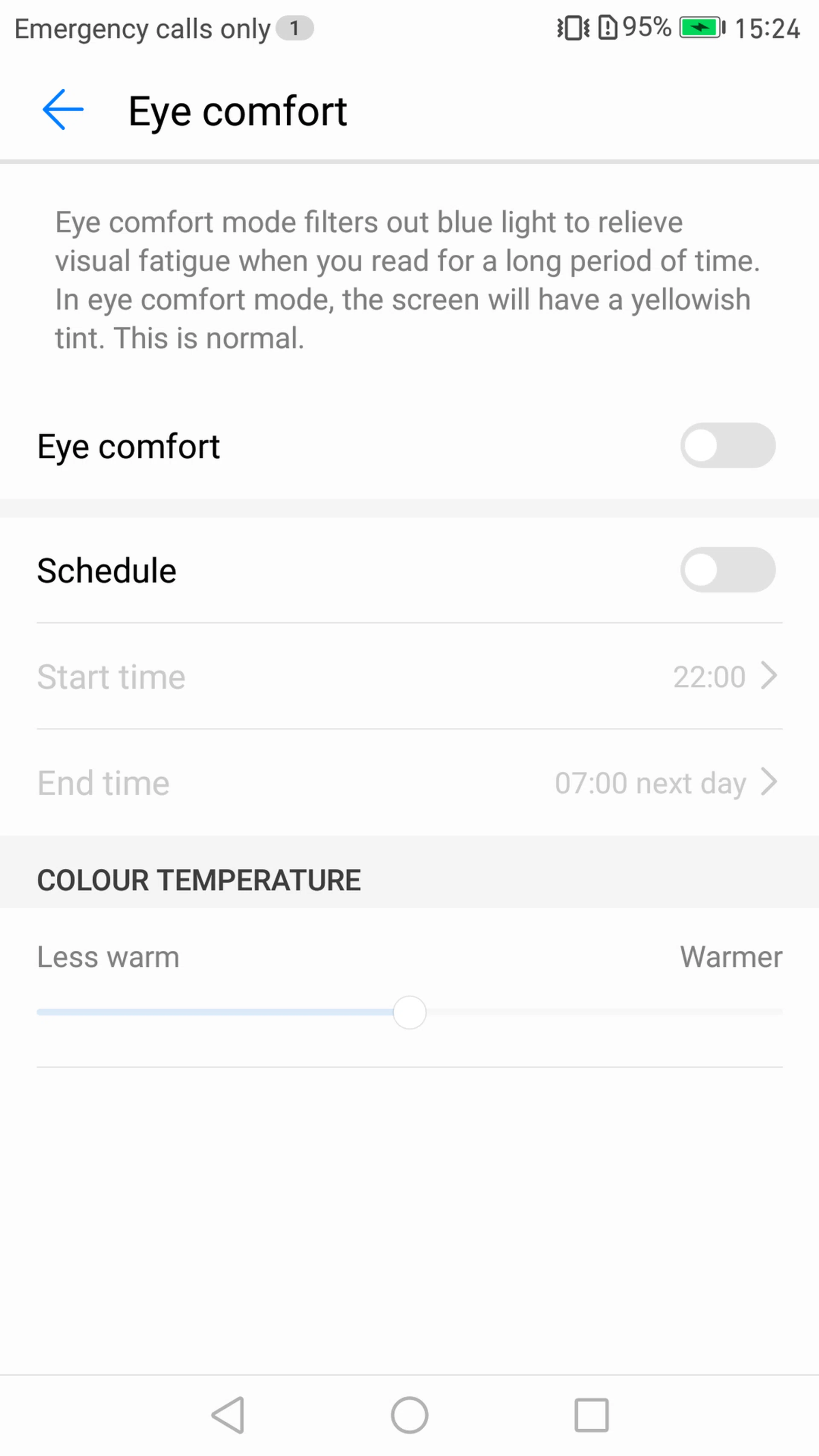 As with many phones today, Huawei has included an option for adjusting the color temperature of the screen as well as an "Eye Comfort" mode, which gives the screen a warm, yellowish cast. This is very similar to Apple's Night Shift mode, which is better for your eyes at night.
