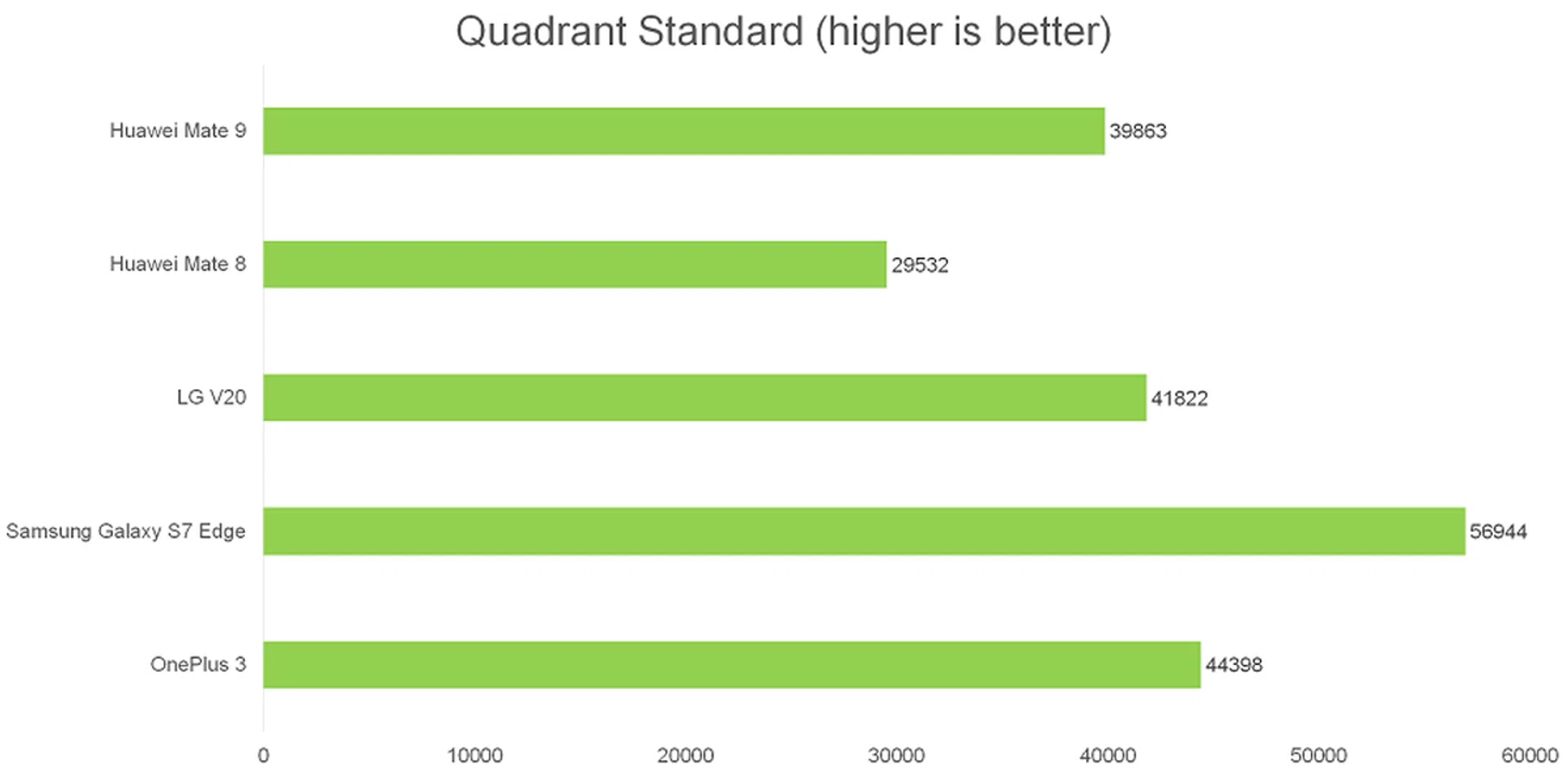 Quadrant is an Android benchmark that evaluates a device's CPU, memory, I/O and 3D graphics performances. As this is an Android benchmark, the Apple iPhone 7 Plus is not included. The Mate 9 performed much better than the Mate 8 but lagged slightly behind both Snapdragon 820-equipped devices. We haven't been able to benchmark an 821 device, but it should score even higher, which unfortunately would put the Mate 9 even further behind. Samsung's Exynos 8890 continues to be untouchable in this benchmark.