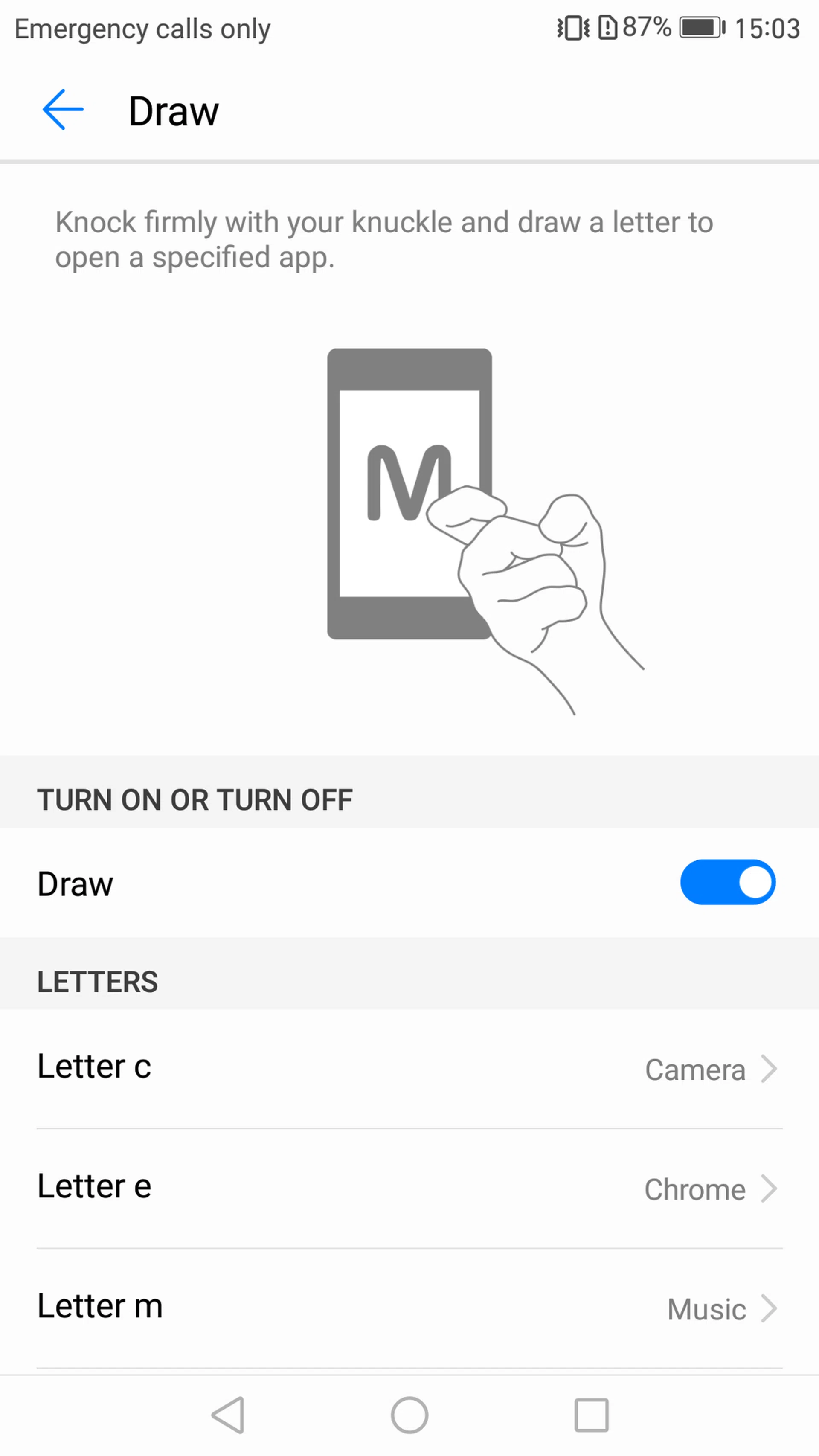 As with previous Huawei phones, you also get Knuckle Sense, which is Huawei's knuckle control system. Most of the gestures carry over from previous models, so for example, you can knock the screen twice with your knuckle to take a screenshot, or write on-screen letters with your knuckle to launch apps. This feature is still as weird as it was when we first saw back on the Huawei Ascend P7, but it's gotten more responsive, and it's now much better at differentiating between deliberate knuckle gestures and accidental screen pokes. If you can remember a few of the gestures, it's actually quite useful.
