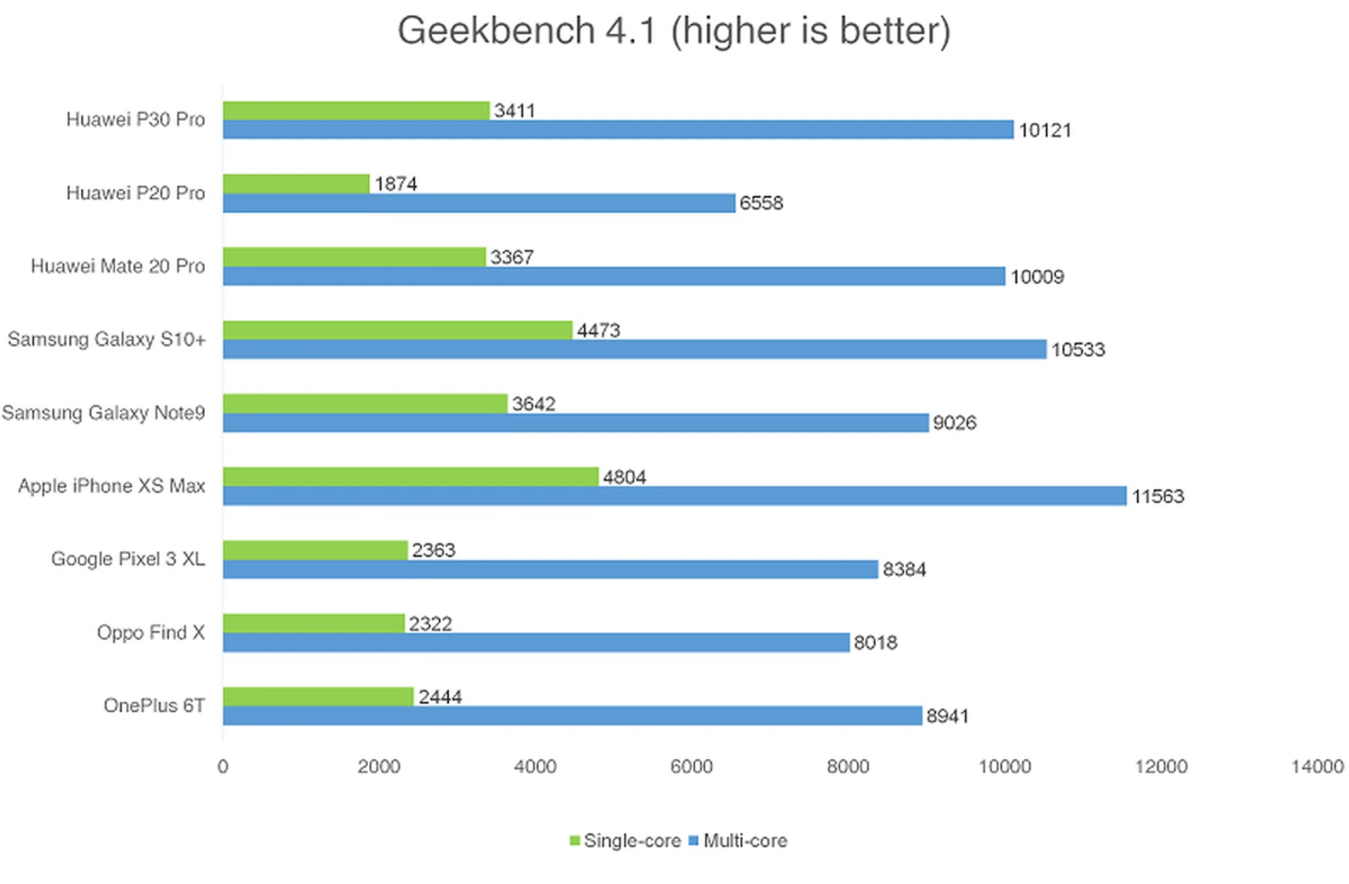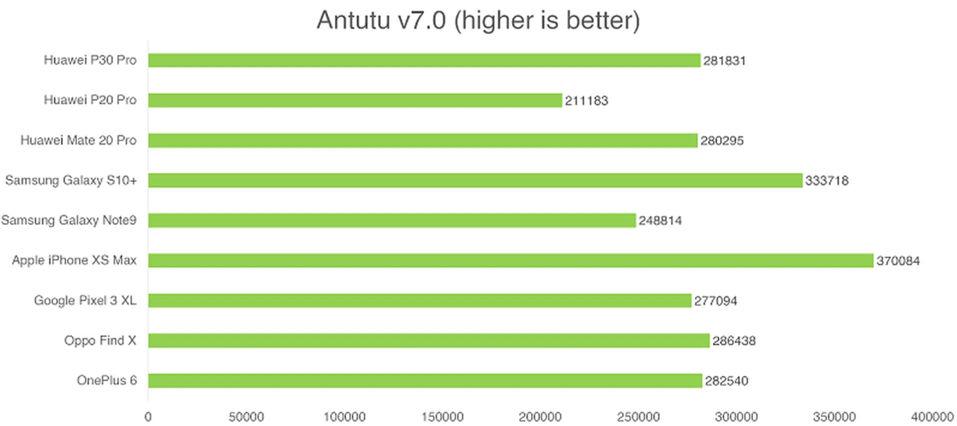 This benchmark shows just how far Huawei has come with its silicon in just one year. While the Kirin 970 in the P20 Pro was a little lackluster, the Kirin 980 outperformed everyone except for Samsung's newest Exynos 9820 and Apple's A11 Bionic.