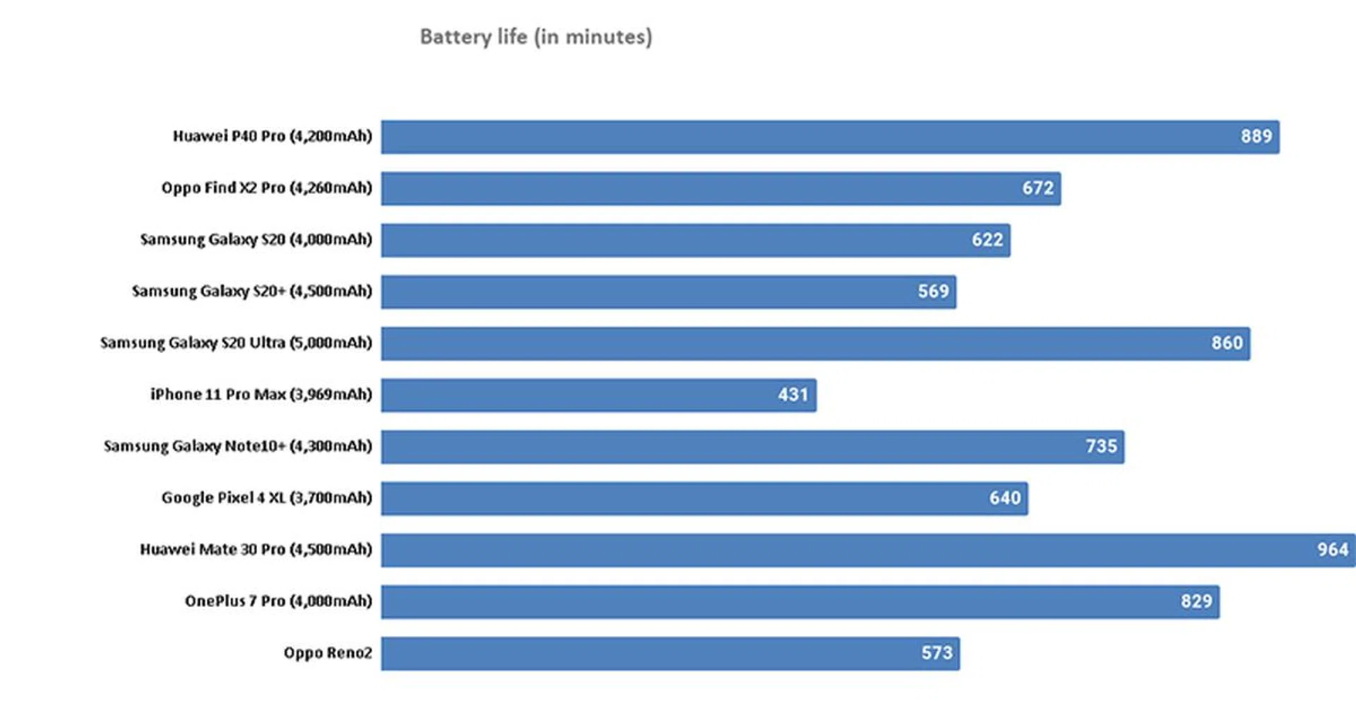 This is where the P40 Pro turns the fight around. The lukewarm flagship processing performance paid off in spades with whopping battery life, even exceeding the S20 Ultra's 5,000mAh battery in terms of uptime. It's no surprise that the Mate 30 Pro (4,500mAh) also lasted almost as long since the chipset is similar save for the 5G modem in the P40 Pro's version. This means that Huawei managed to squeeze out just a little more performance for a similar chipset while maintaining its uptime.