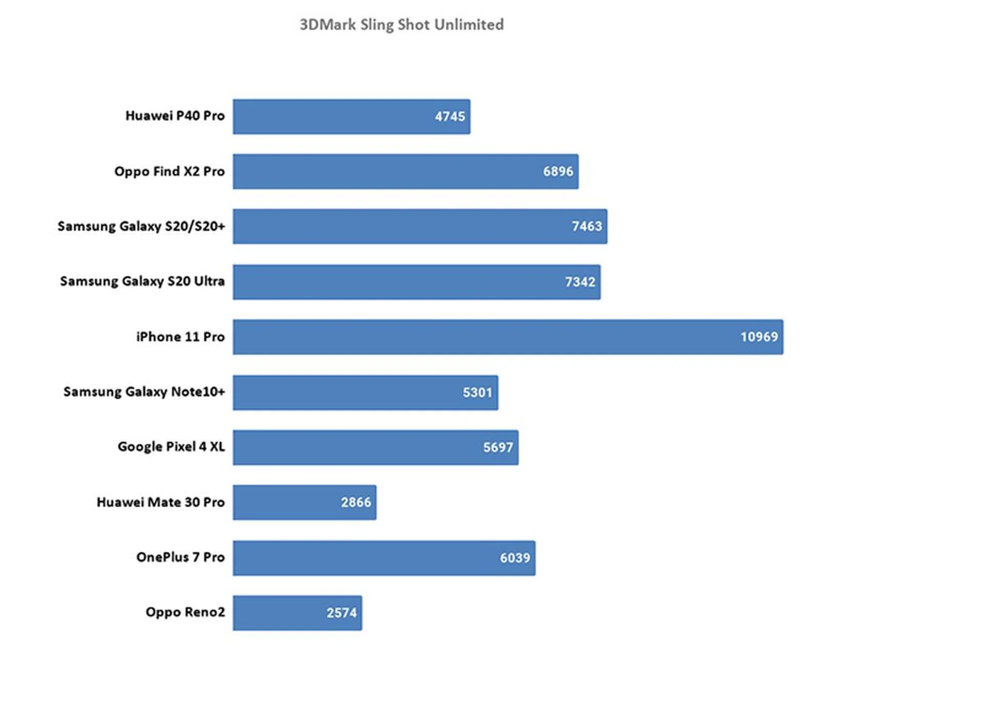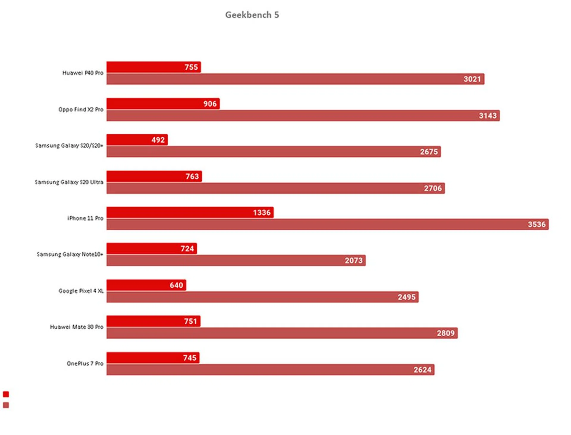 Geekbench's findings are aligned with AnTuTu's, so it's not surprising that we see this chart's results. However, it's worth noting that the P40 Pro's processing is almost on par with devices carrying the Qualcomm Snapdragon 865 chipset.