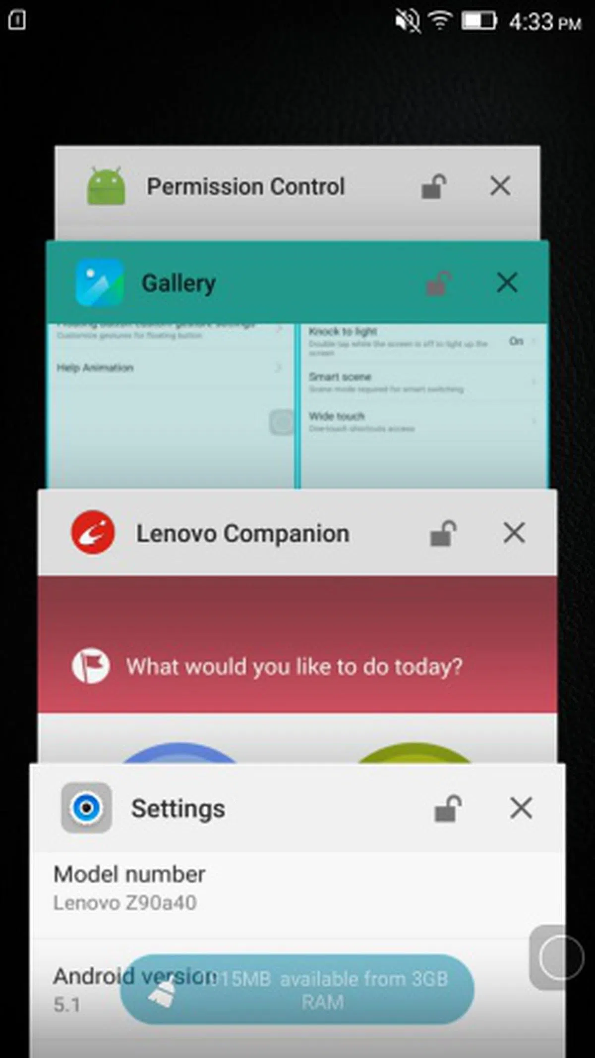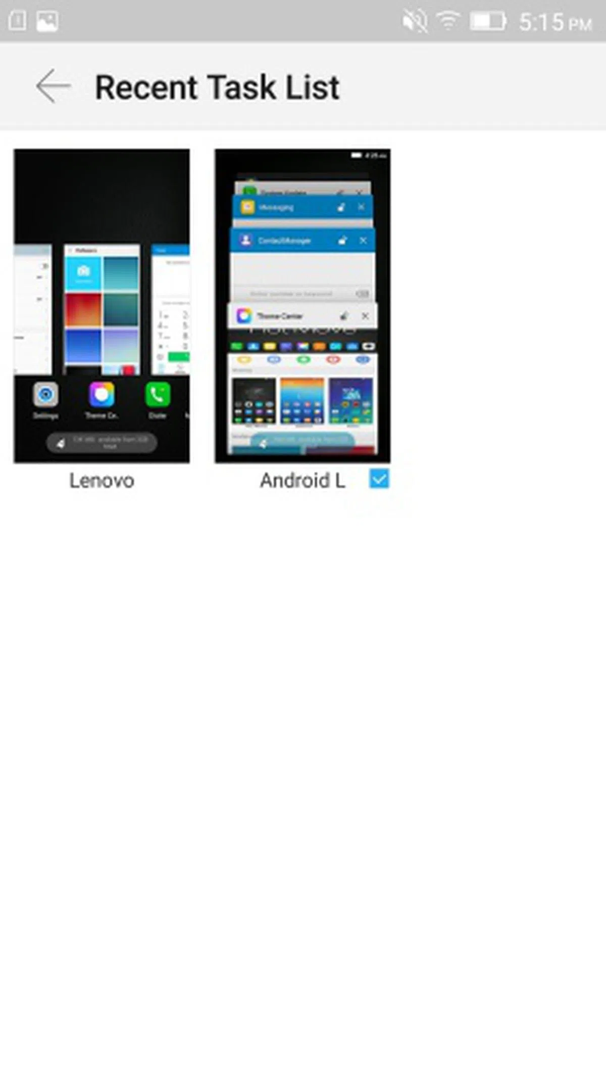 As mentioned, there are two recent task list options for you to choose on the Vibe Shot. The first one is by Lenovo, which looks like a blatant copy of Apple's previous multitasking interface. The second one mimics Android Lollipop by having a stacked card interface. Both options come with an option to clear all background apps with one touch.