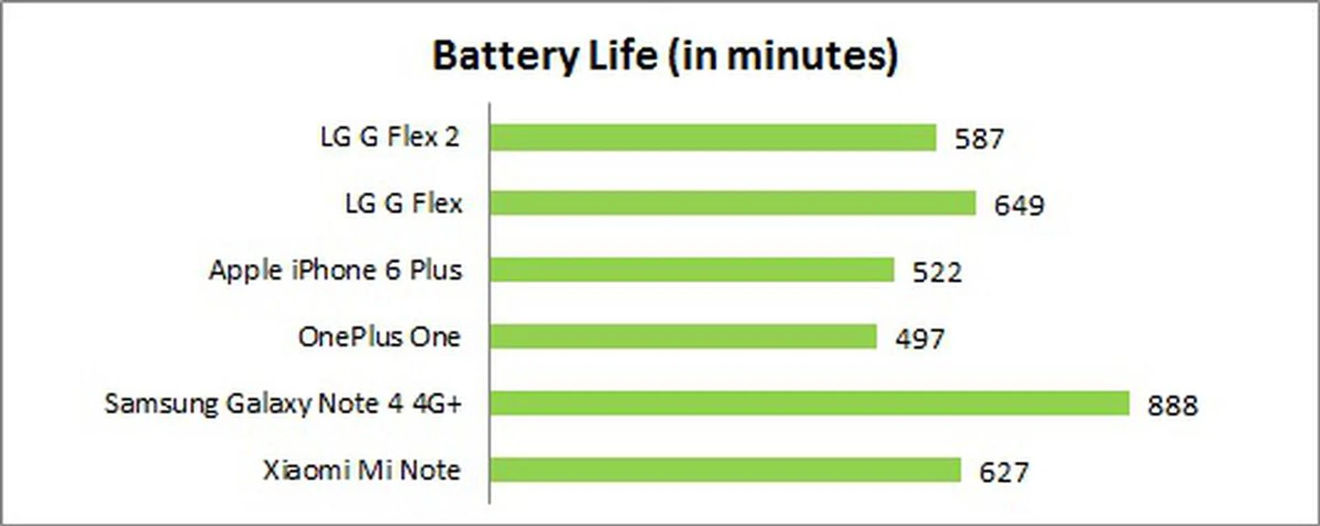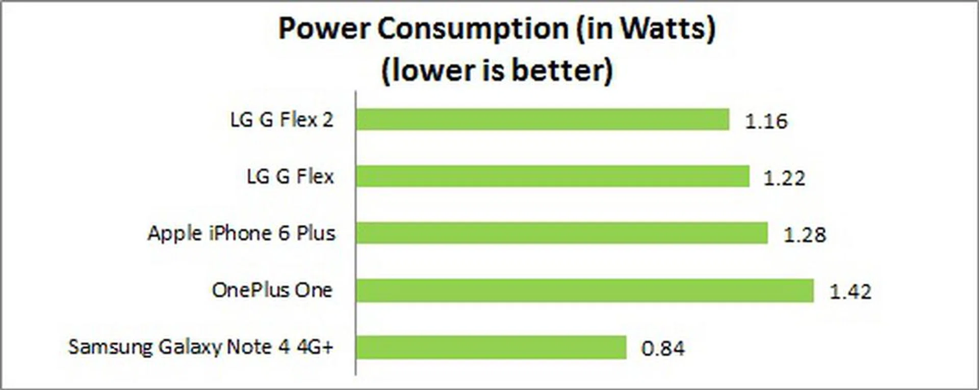 A higher resolution display coupled with a smaller battery resulted in the G Flex2 lasting an hour (10%) shorter than its predecessor at slightly below 10 hours (to be exact, it's 9 hours and 47 minutes). It holds its own against the iPhone 6 Plus and OnePlus One while the Galaxy Note 4 4G+ still maintains the lead with its more power-efficient Super AMOLED display as seen in the Power Consumption chart. The G Flex2 also falls short of the standard set by the Mi Note, which lasted about 7% longer despite having a 5.7-inch full HD display and the same battery capacity. Overall, power efficiency on the G Flex2 is considered quite good as it is lower than most of its phones in its category.