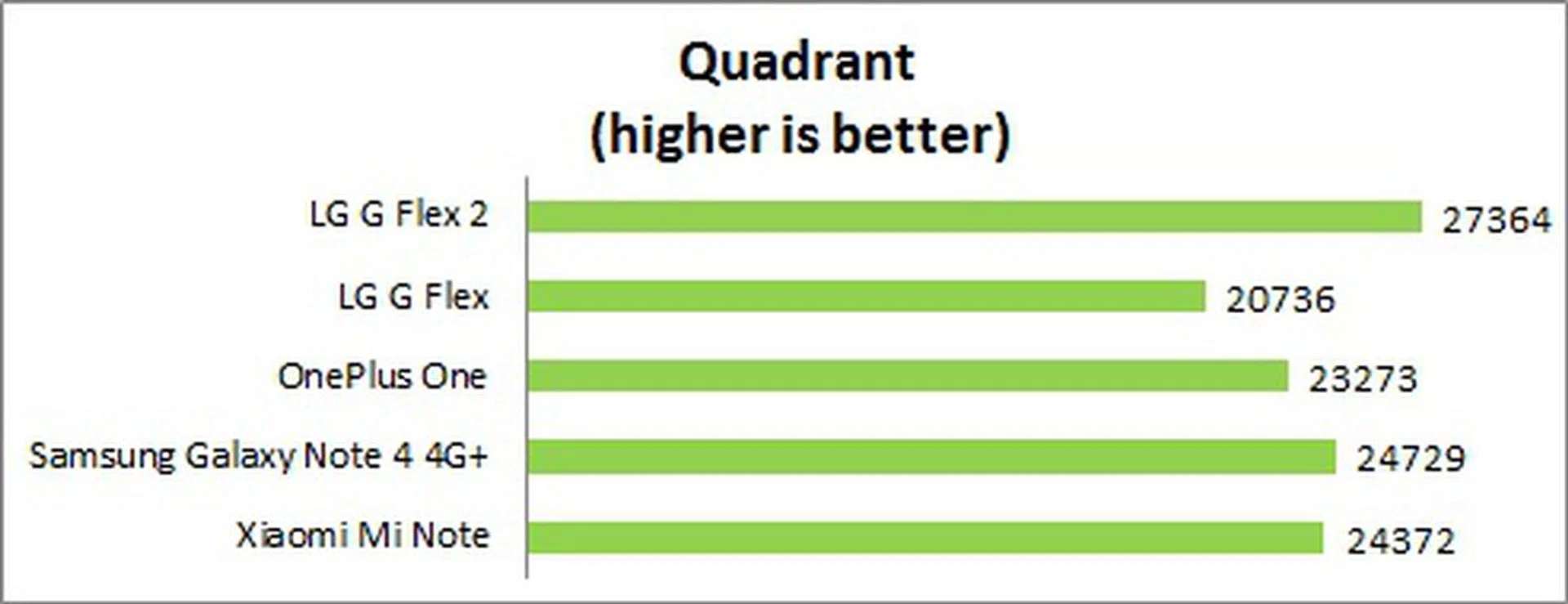 Quadrant evaluates a device's CPU, memory, I/O, and 3D graphics performance. This is an obvious win for the G Flex2; it has the highest Quadrant score to date of 27,364, which is expected since it runs on the most powerful Snapdragon processor available in the market. Performance gain is about 10% compared to the Snapdragon 805 in the Galaxy Note 4 4G+.