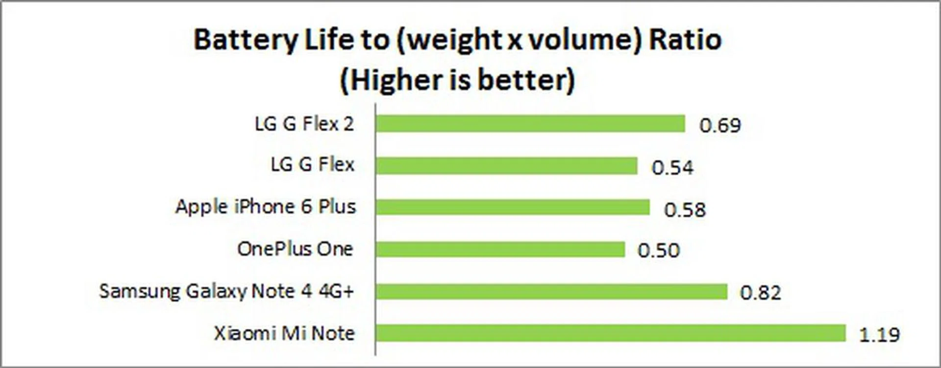 We measured the portability of a device by calculating its battery life to (weight x volume) ratio. As the lightest and one of the more compact 5.5-inch phones in this comparison, the G Flex2 naturally edges out most of the competition except Samsung and Xiaomi, which were higher due to better battery mileage.