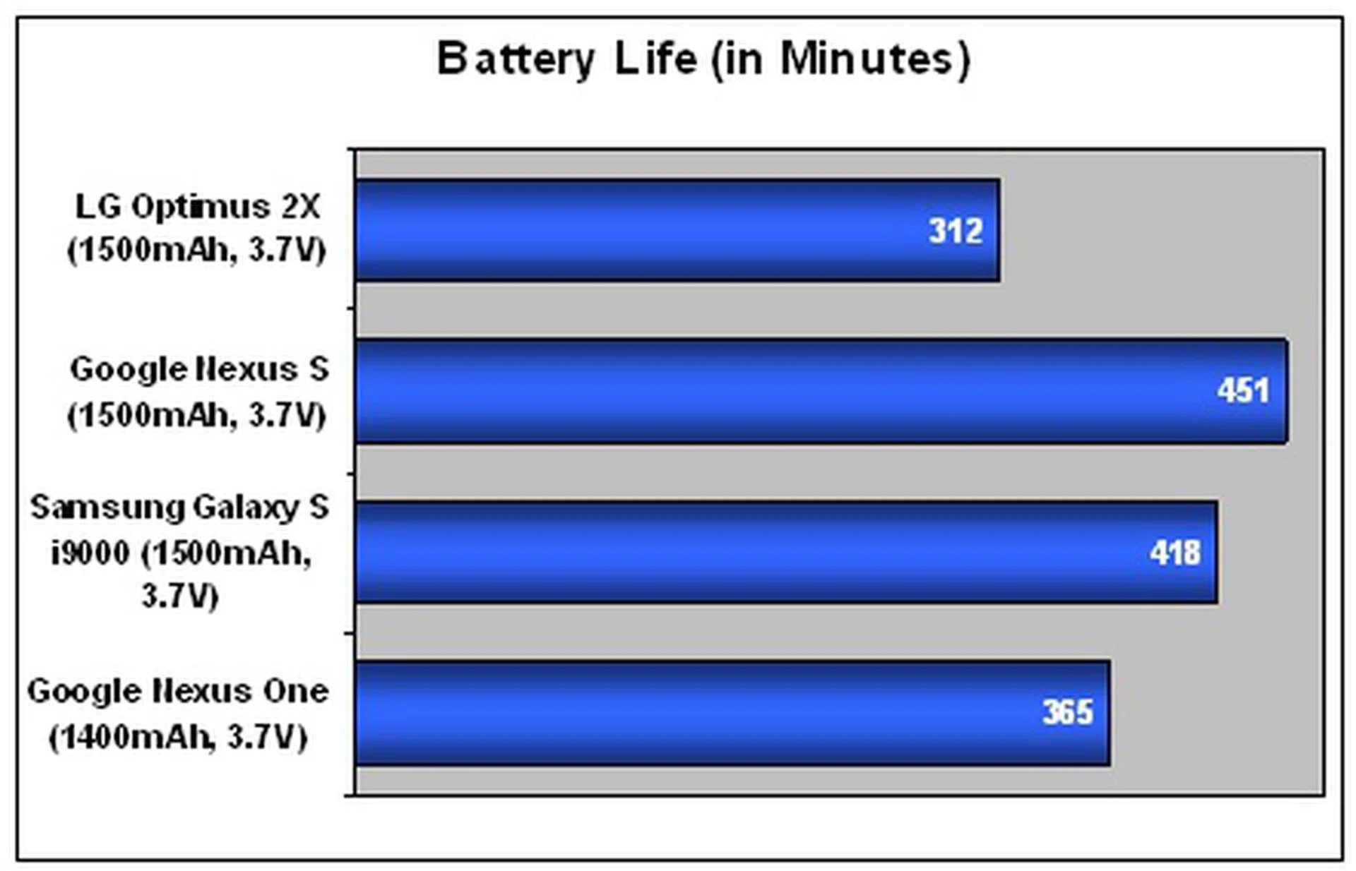As usual, we compare the Optimus 2X's battery performance with a selected group of devices chosen based on their similarities across battery capacities, display sizes, resolution and processing power. This standard battery test consists of looping a 240 x 320 pixels resolution video clip at 100% volume and screen brightness, with Wi-Fi and Bluetooth active with push email or data being pulled at regular intervals. For the LG Optimus 2X, we compared it against similar Android devices such as the Google Nexus S, Samsung Galaxy S and the Google Nexus One.