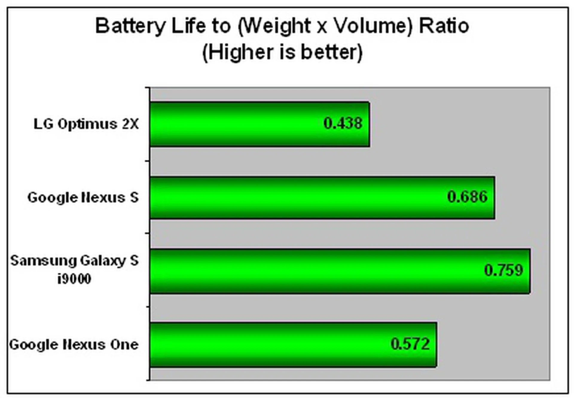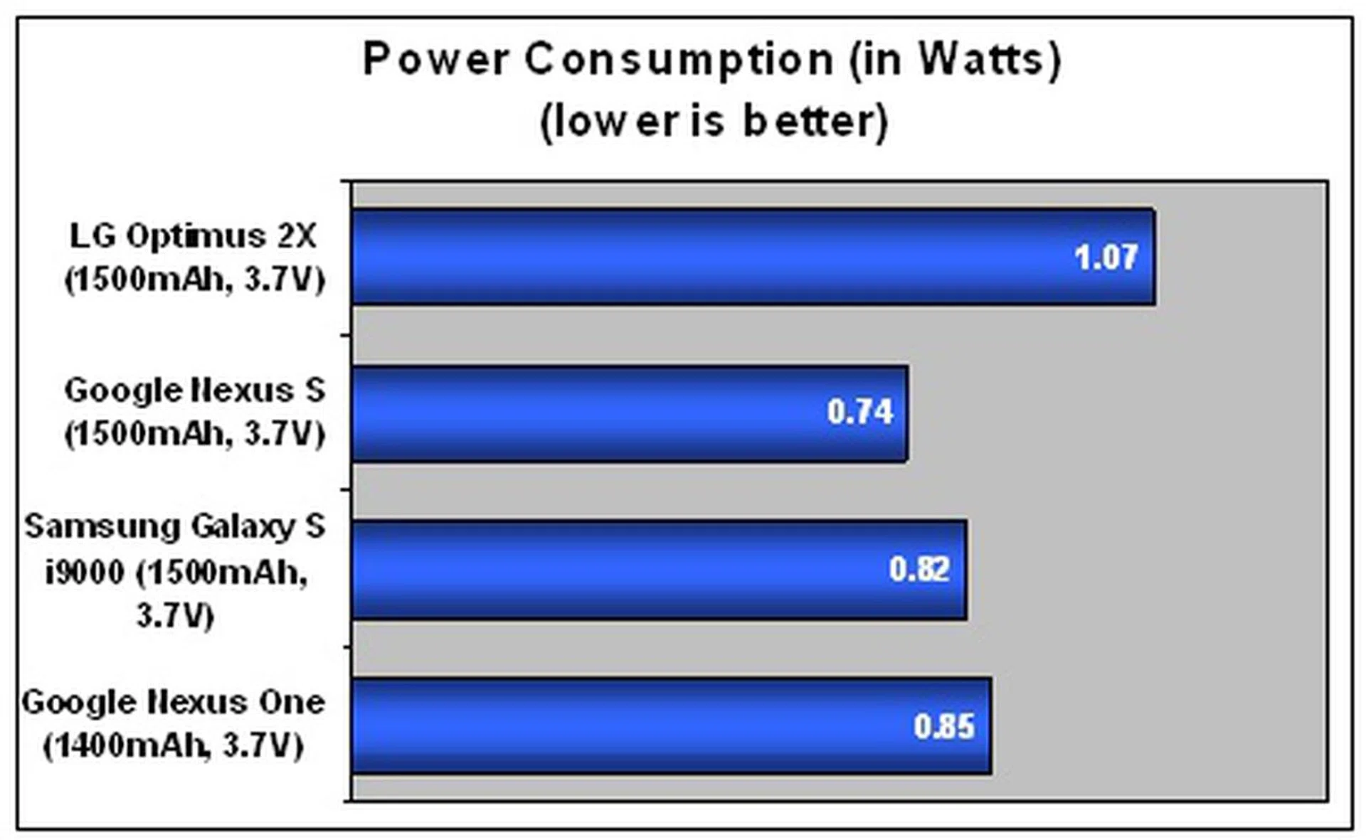The LG Optimus 2X underperformed in this area, displaying the weakest result of the bunch, only lasting for a fair 5+ hours when we ran our tests. Judging by the power consumption benchmark results, the phone uses about 28-30% more power compared to the rest. Factors like screen sizes, UI and differing operating systems play a part in optimizing battery consumption - and so does the processor. In this case, despite having a more powerful processor, the phone's battery life in intensive usage takes a 50-100 minutes cut - chalking up to a less-than-efficient power consumption. Notably, while rationing it for normal day-to-day operations, the phone could last for at least three-quarters of a full day.