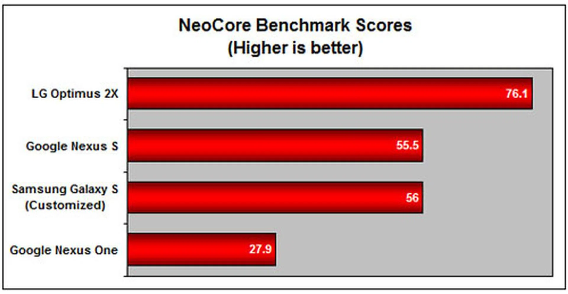 - The second benchmark is NeoCore - it is targeted towards the device's GPU performance. This is especially important given how smartphones of today have evolved into an alternative, high-powered device that dabbles in heavy graphical interfaces and gaming - especially important in the LG Optimus 2X's case as it is outfitted with hardware meant to boost game and graphics rendering.