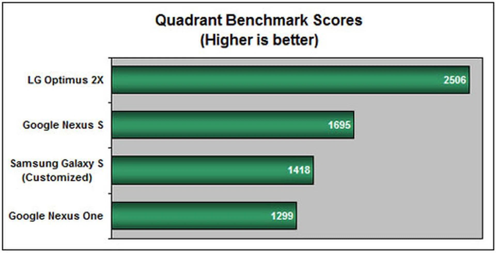 Both results reflected here show that the LG Optimus 2X showcased far superior results compared to the other smartphones . The answer is pretty self-explanatory here. Nonetheless, we have to stop and ask ourselves whether the extra processing power is actually all that necessary. Case in point: all the phones that we have pitted the Optimus 2X against ran on less powerful and yet decent 1GHz processors. Based on our testing and usage, all phones fared well with no sluggish performances noted; screen transitions and browsing were smooth even with multiple apps running in the background. Of course, the Optimus 2X does all these better, but the improvements are incremental, or bluntly put, not essential for the average handphone-toting crowd. The biggest selling point that Tegra 2 touts is processing multiple apps and multi-tasking while ensuring no slowdown in speed - which most phones of even less than half of the scores can achieve.
