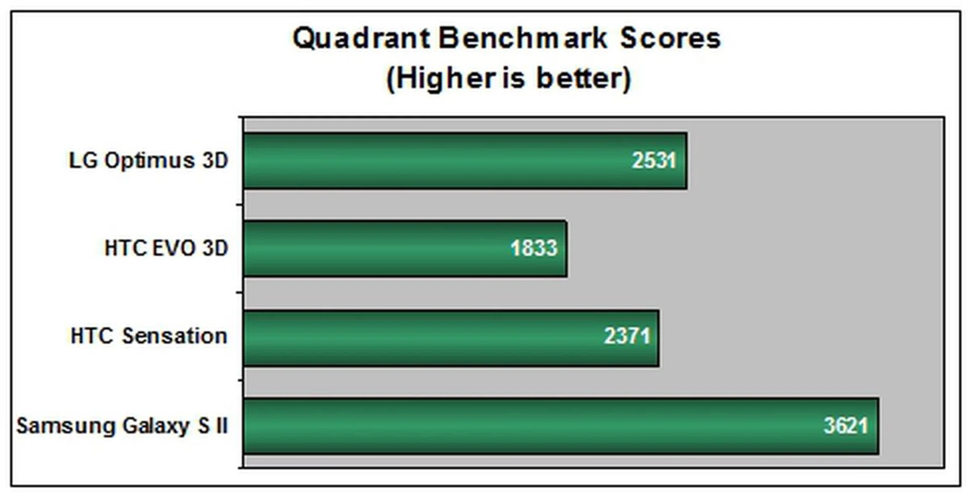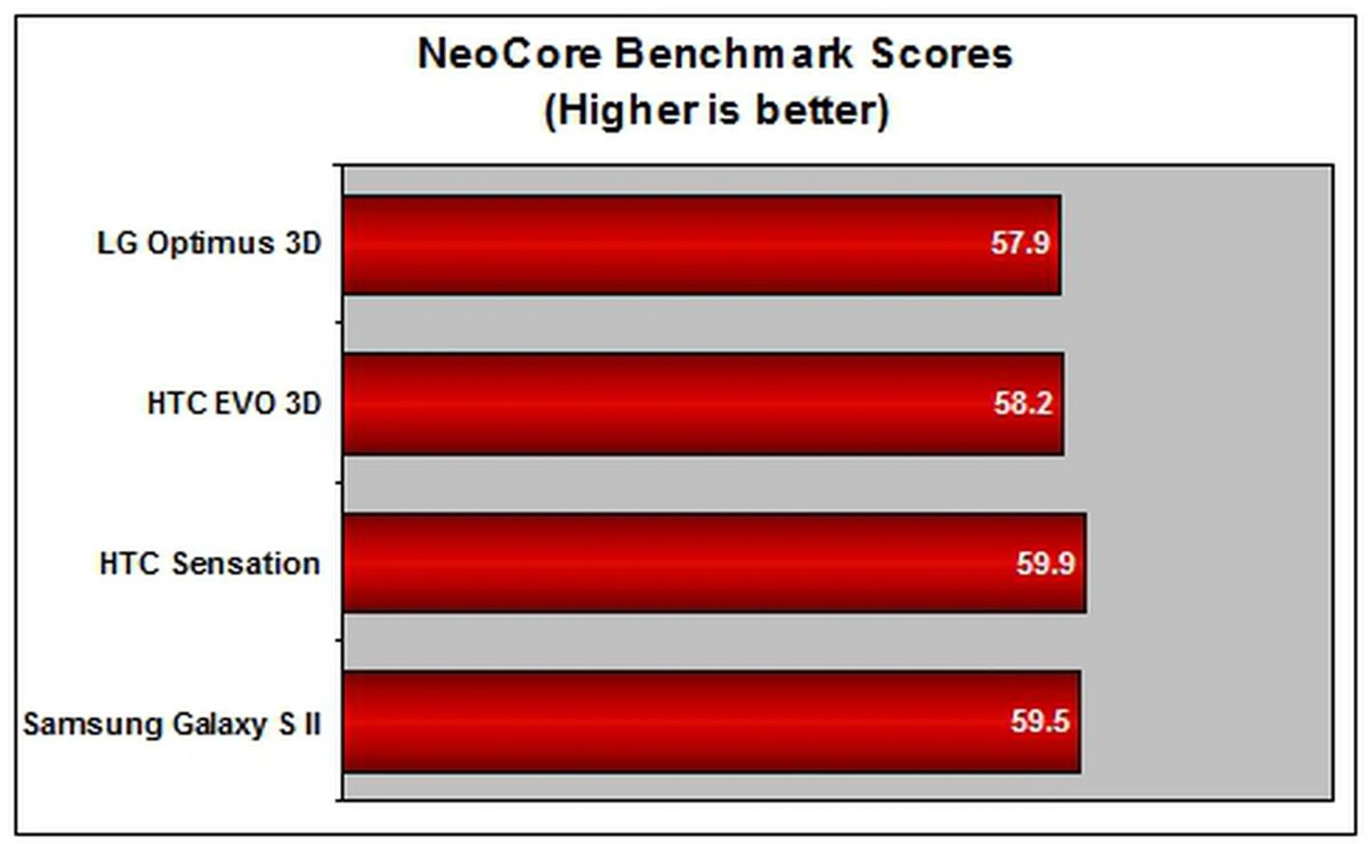 With a score of over 2000 on most of the dual-core devices (considering how usually only single-core variants manage below this mark), the Quadrant benchmark did not deviate much from the expected results. The LG Optimus 3D comes with the least powerful hardware specs out of the lot (not to mention that it is preloaded with Android 2.2 instead of 2.3). Nonetheless, the smartphone sports a powerful dual-core 1GHz processor and ample 512 RAM. Benchmark results show however, that the LG Optimus 3D came in second in terms of Quadrant benchmark scores, almost nose-to-nose with the HTC Sensation's results. Noticeably, it performs better than its closest competitor, the HTC EVO 3D despite the latter's dual-core 1.2GHz and 1GB worth of RAM. Considering both HTC devices run on a graphics-intensive Sense UI, this fact might play in LG Optimus 3D's favor.