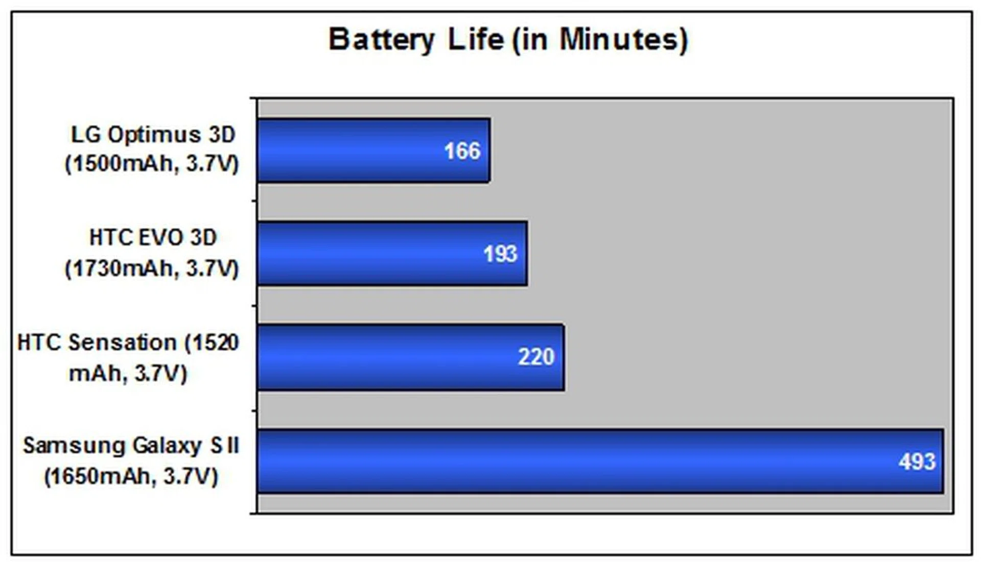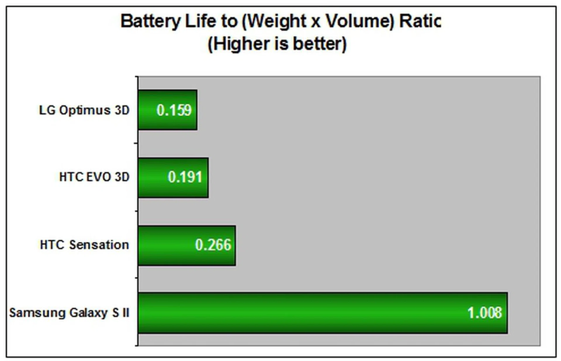 Unsurprisingly, packing in extra features into a smartphone also increases its weight. Taking a look at the comparison table, you will note that both LG Optimus 3D and HTC EVO 3D are equipped with larger and heavier bodies; the former weighs in at 168g and the latter, 170g. Naturally, these factors have negative bearings on the battery life to (weight x volume) ratio. Coupled with only 2.77 hours of battery time and a larger, heavier body, the Optimus 3D had the lowest portability index in the lot, making the Samsung Galaxy S II an obvious choice for those who want the best of both mileage and good portability.