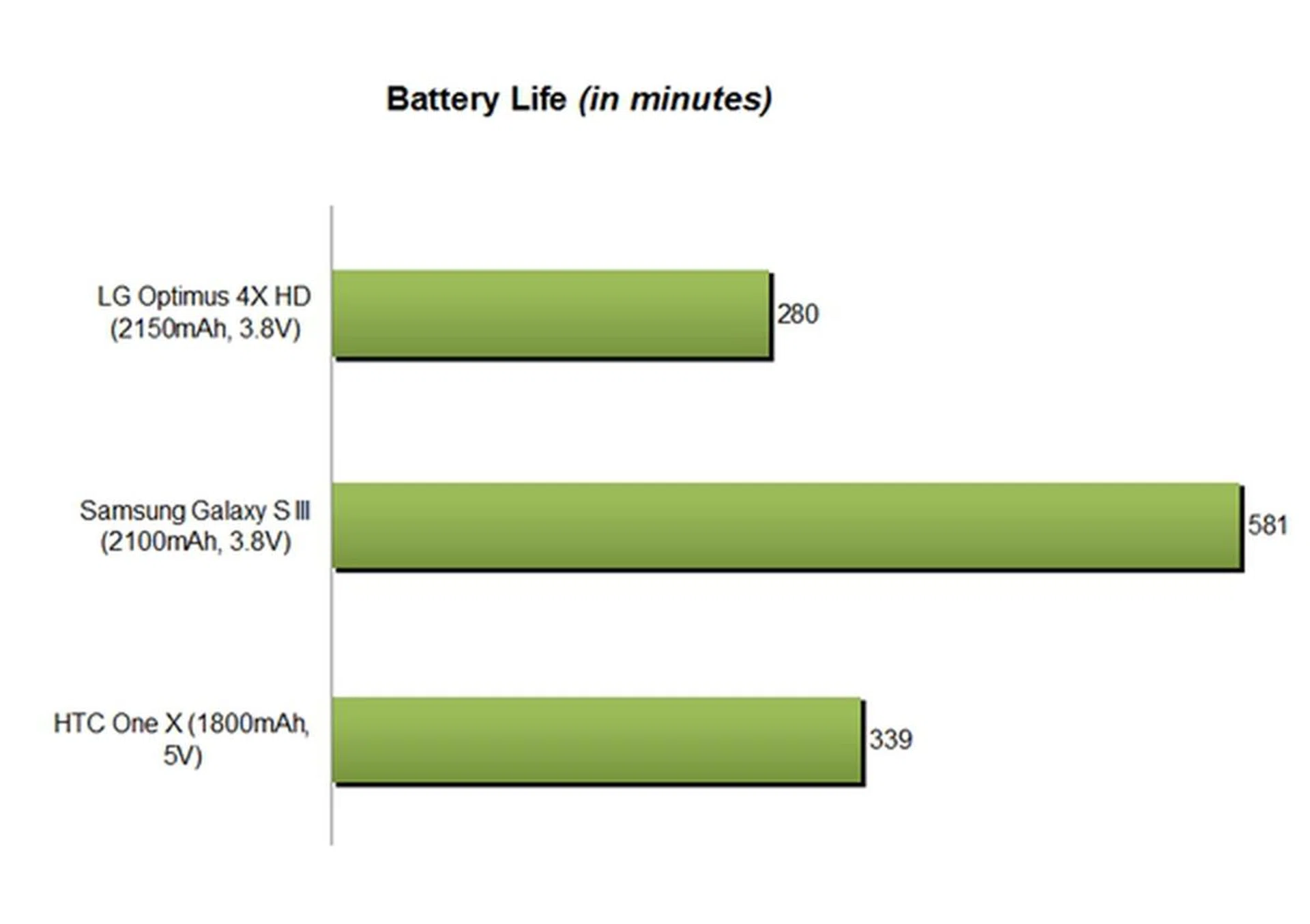 The LG Optimus 4X HD didn't perform too well in the battery test, lagging behind both its quad-core competitors. The Samsung Galaxy S III remained at the top of the trio with 581 minutes uptime! In comparison, the Optimus 4X HD only obtained 280 minutes of video playback before refusing to play the video at the 3% mark. Even HTC One X's mediocre 339 minutes managed to outlast Optimus 4X HD. The only obvious reason for this outcome despite its listed specs about is because of the phone's power consumption which certainly needs improvement. The wide margin over its competitors can be attributed to several factors: an energy-sapping HD IPS touch screen, less power-optimized software and as mentioned earlier, a heavier body.