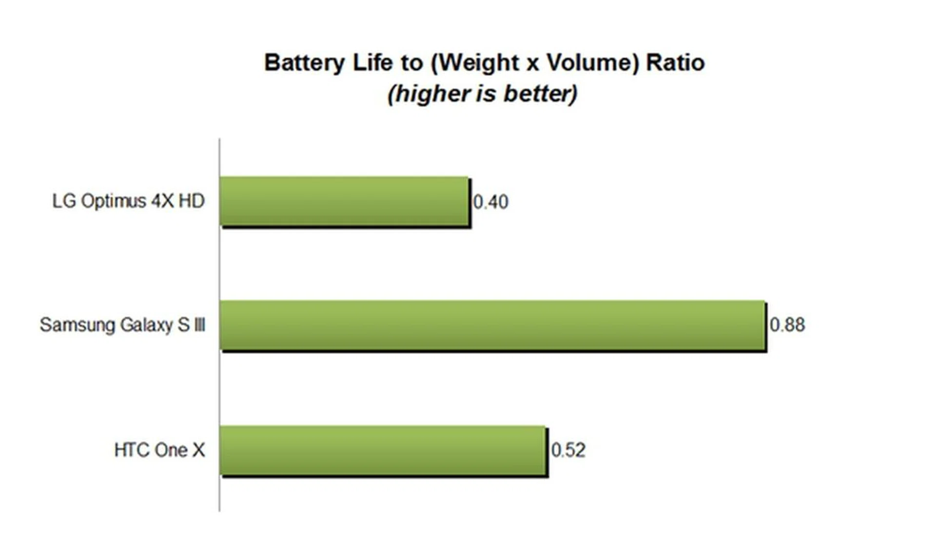 The results are likewise replicated in the portability index (battery to volume ratio). While the LG Optimus 4X HD shares almost similar dimensions with the other two quad-core devices, it is slightly heavier than the comparisons. Coupled with its low battery mileage, it is unsurprising that the Optimus 4X HD came up last in this index.