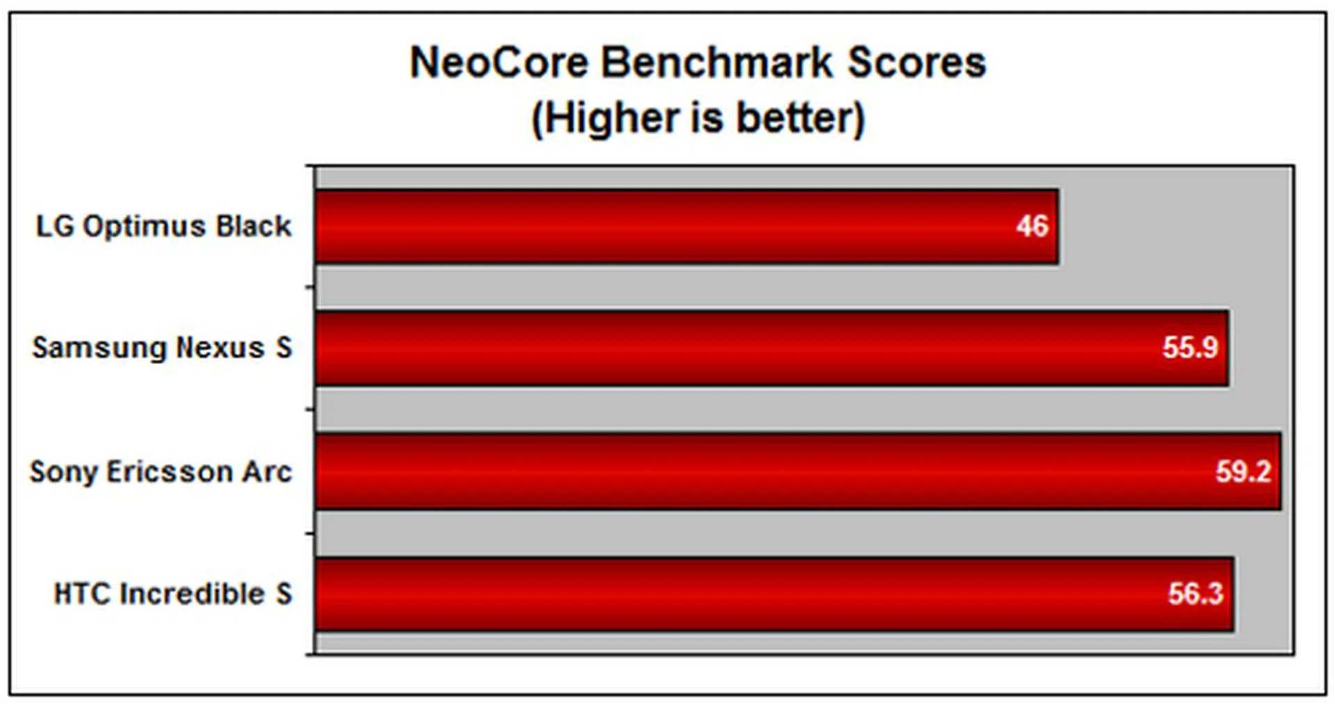 As we've mentioned, Quadrant does measure the overall performance, and thus the device's memory comes into play. With only 512MB RAM loaded on the Optimus Black, it's not surprising to see the numbers falling short of what is seen on the Xperia Arc and Incredible S. Its NeoCore result has also shown it to be the weakest, clocking in at 46fps while the rest are reporting at least 55fps in the benchmark.