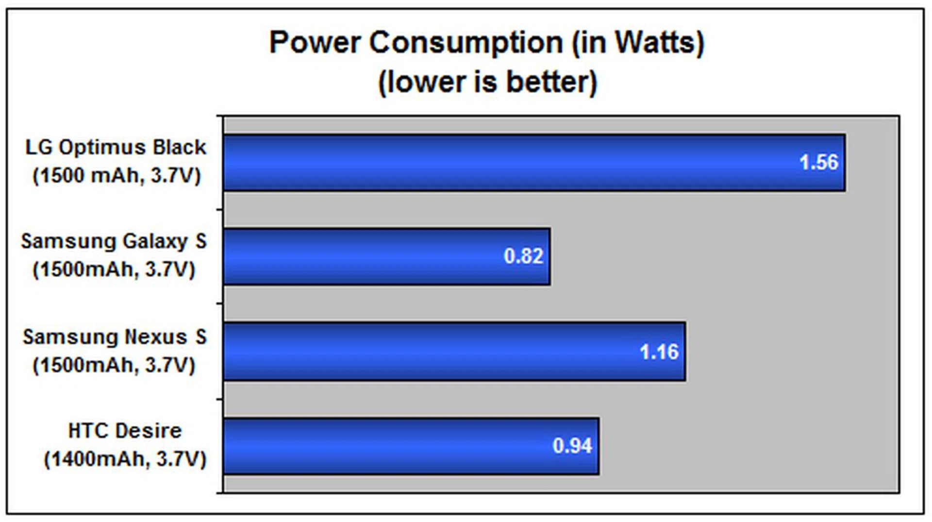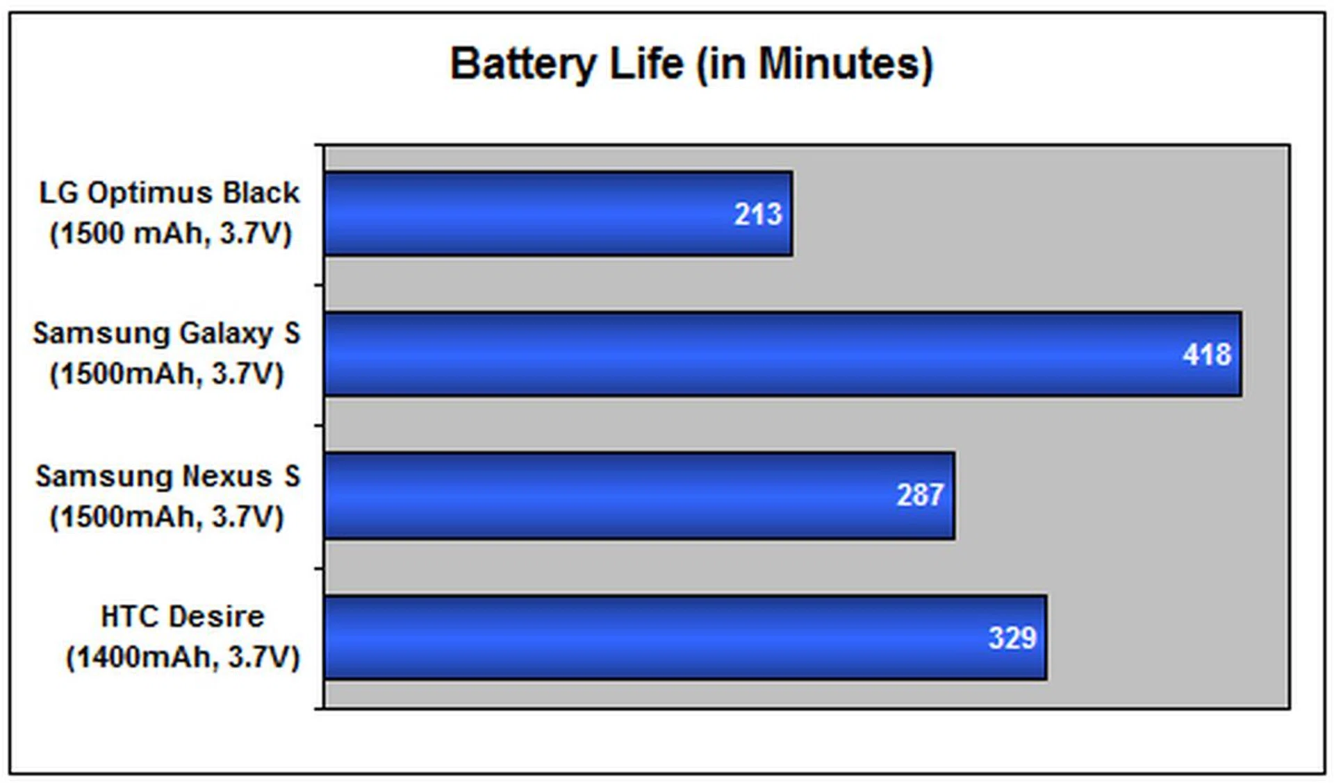 With different panels such as IPS, AMOLED and S-LCD under comparison, the test parameters aim to keep the data under strict control. But here's some food for thought: the Optimus Black's maximum brightness is relatively higher than its counterparts. While our test parameters are kept consistent to get a fair assessment on the battery performance, it is understandable that power consumption is increased with a higher brightness level. As such, the lower scores from the Optimus Black's battery life is not a surprise, and given how we've mentioned that the screen can be a tad blinding, you'll most likely keep the brightness to a minimum level and thus get a slightly better overall mileage.
