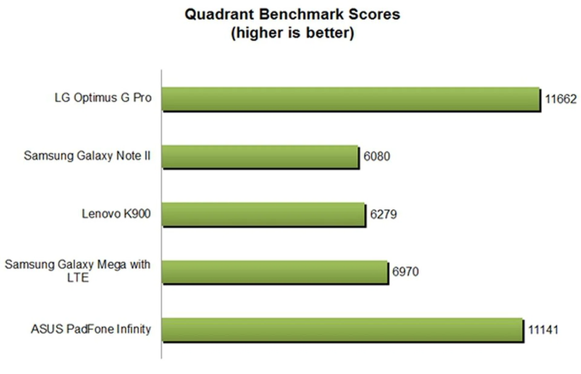 As usual, we'll be comparing the performance of the Optimus G Pro against its immediate rivals such as the Galaxy Note II and Lenovo K900. We also compared it against the 6.3-inch Galaxy Mega with LTE and ASUS PadFone Infinity. First, we used the Quadrant benchmark to evaluate the CPU, memory, I/O and 3D graphics of the Android devices.