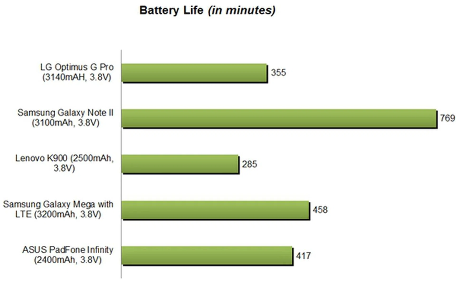 Despite having the largest battery capacity in its class, the Optimus G Pro failed to last as long as the Galaxy Note II. Our standard battery test indicates that the Optimus G Pro managed an uptime of 5 hours and 55 minutes, whereas the Galaxy Note II lasted a whopping 12 hours and 49 minutes.