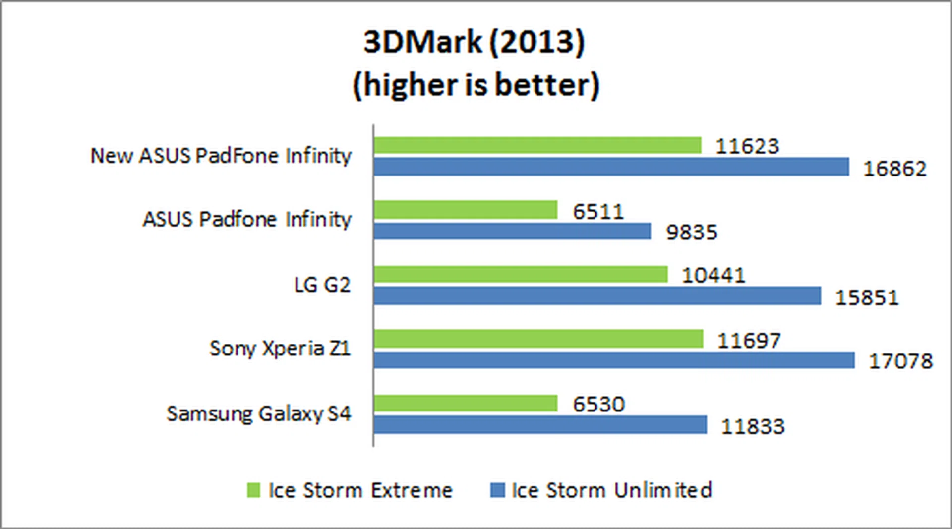 The new PadFone Infinity maxed out the score on Ice Storm so we will be looking at its scores for Ice Storm Extreme and Unlimited.