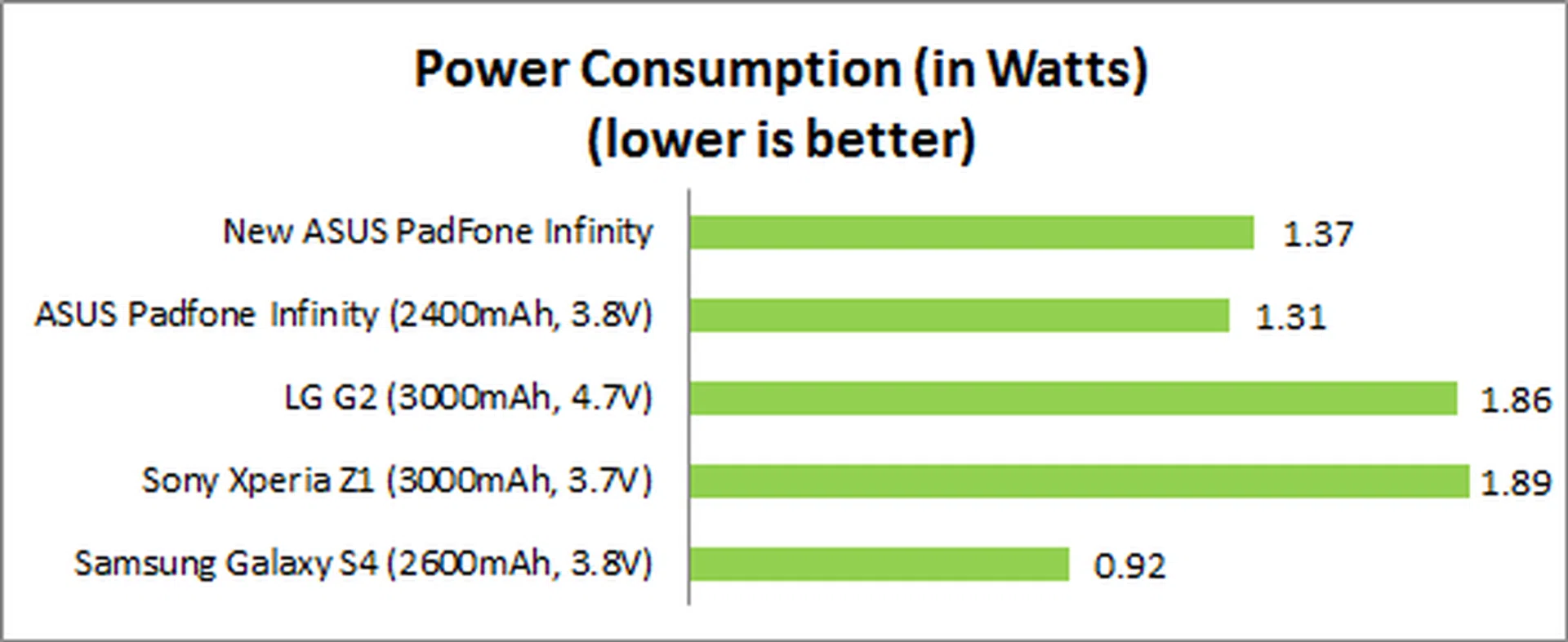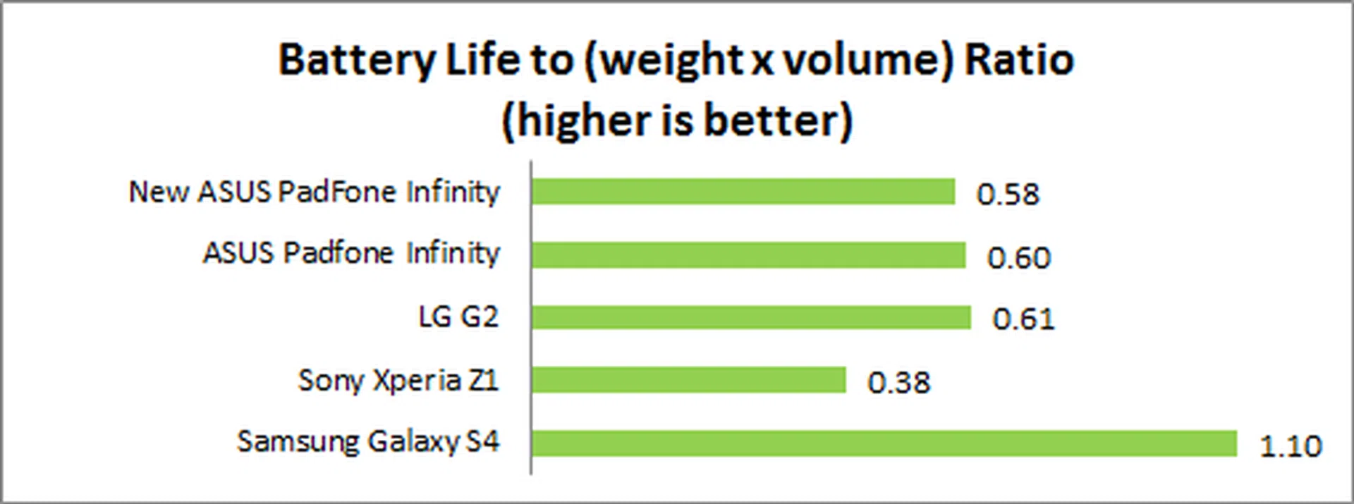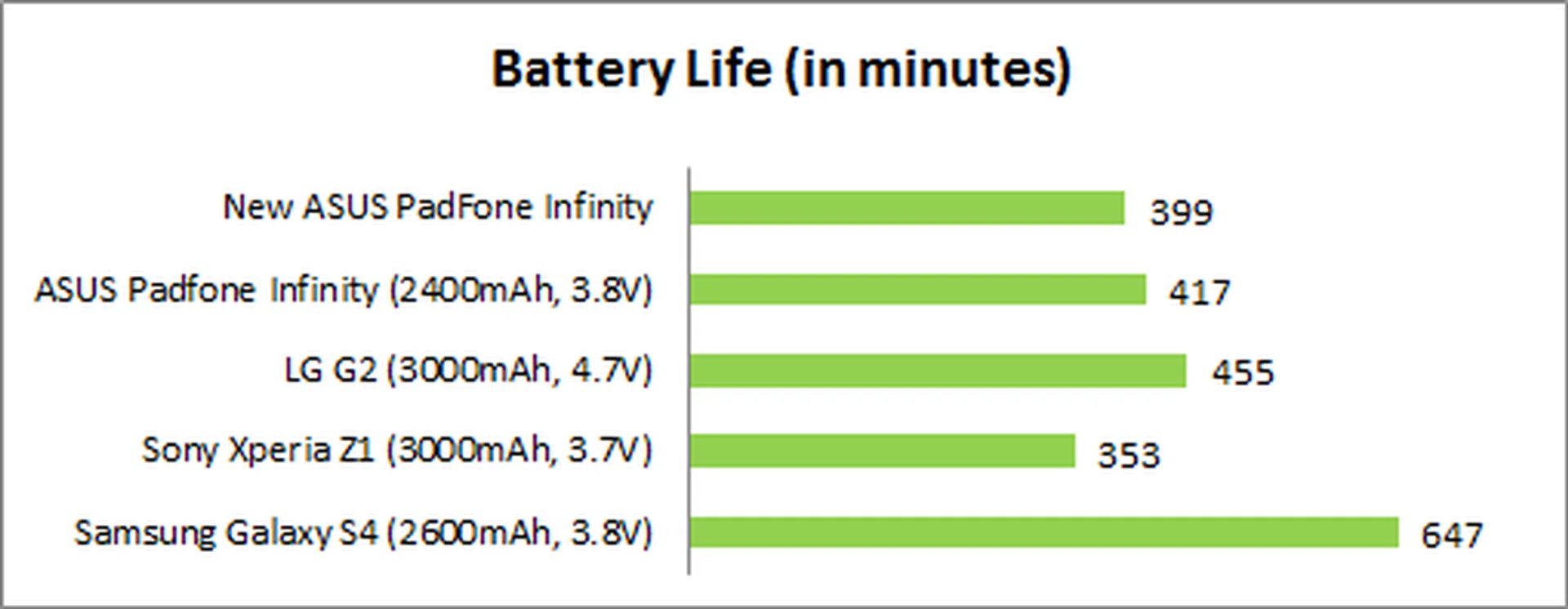 Battery life was slightly worse than the older PadFone Infinity, presumably due to the more powerful Snapdragon 800 processor drawing more power than the older model. Compared to other models, battery life is slightly lower than average (although it still beat the Sony Xperia Z1).