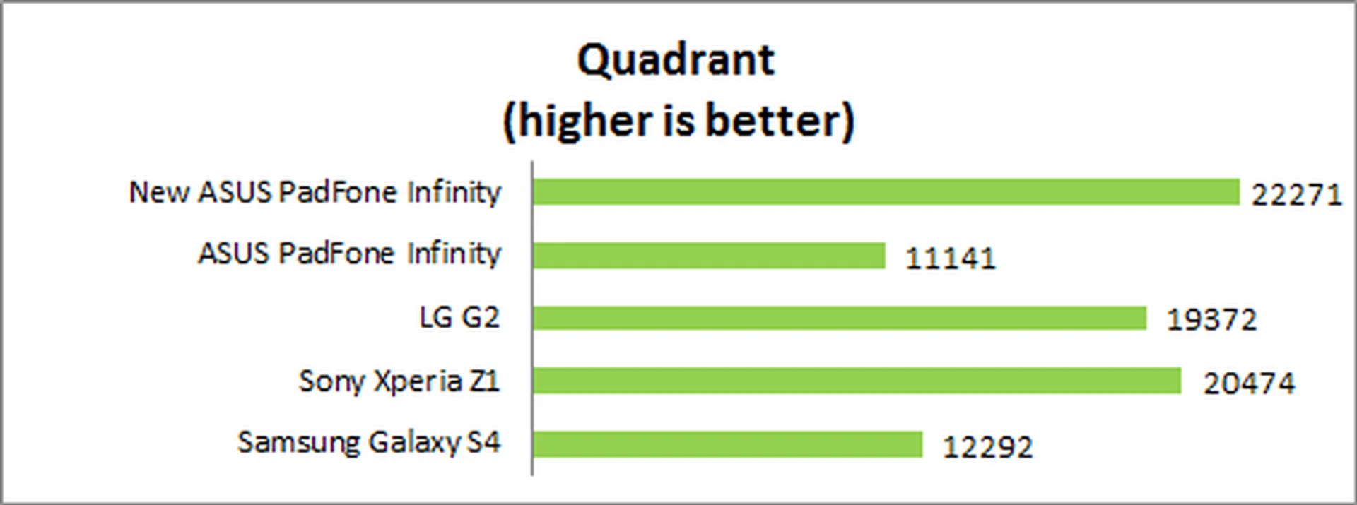 Quadrant evaluates a device's CPU, memory, I/O and 3D graphics performance. As expected, the new PadFone Infinity performed well, far outperforming the older Snapdragon 600-equipped version. Impressively, it also managed to outperform both of our other Snapdragon 800-equipped devices: the LG G2 and Sony Xperia Z1.