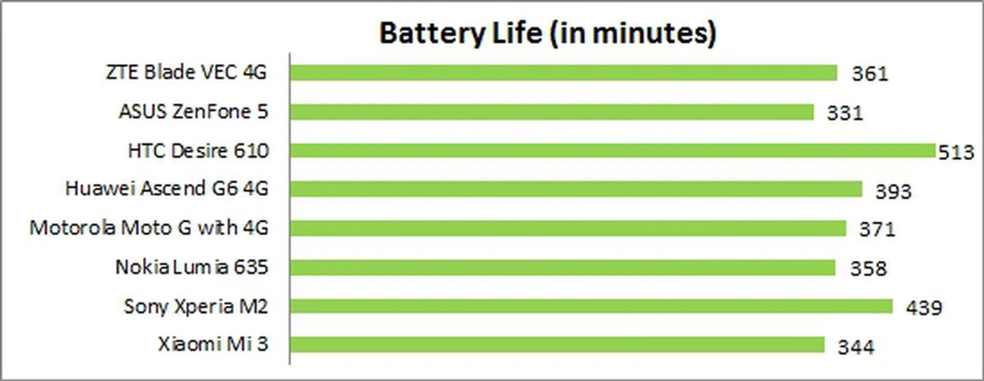 The Blade VEC 4G lasted slightly over six hours in our battery test, which is 30 minutes longer than the ZenFone 5. Based on the Power Consumption chart, the Blade VEC 4G has a slightly lower power draw compared to the ZenFone 5. This explains why the ZTE phone could last about 10% longer. It's acceptable for the Blade VEC 4G to have a higher power draw compared to the rest of the phones (except the Mi 3) as it has a bigger, higher resolution display than most of the phones we've compared.