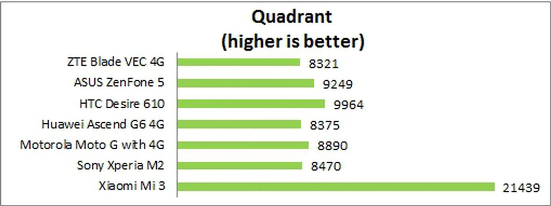 The Blade VEC 4G is on-par with competing phones of its class in the Quadrant benchmark except the Mi 3, which runs on the newer, faster Snapdragon 800 chipset.