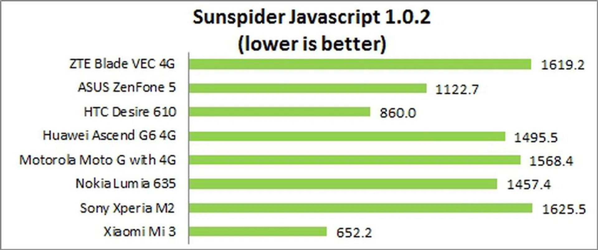 In the SunSpider Javascript, the phones fared differently. The Blade VEC 4G and Xperia M2 came in last while the Mi 3 and Desire 610 are the only phones to score below the thousand milliseconds mark. This only proves that devices with the same hardware specs (same processor, same amount of RAM) may not necessarily deliver similar performance.