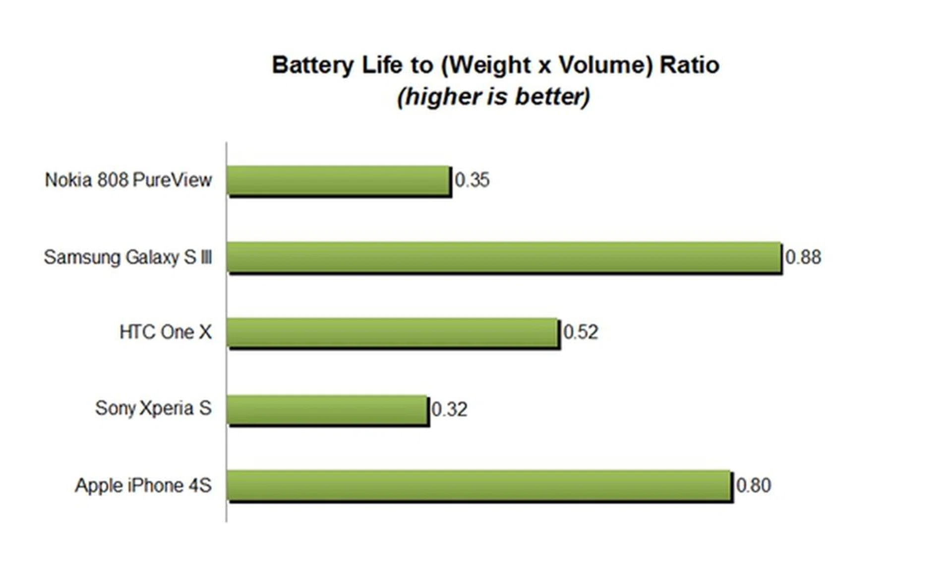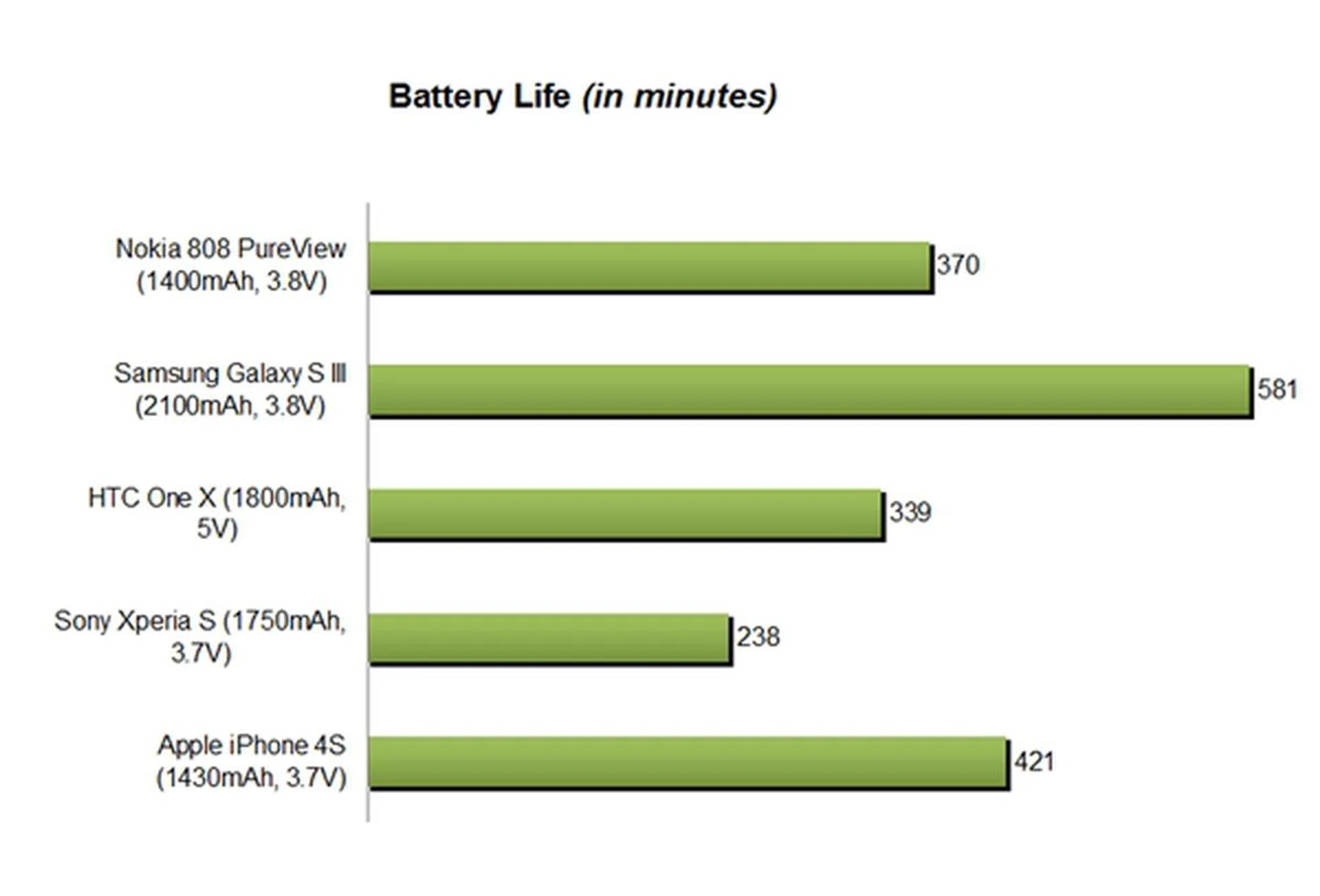 We selected the above comparison devices primarily based on their camera capabilities; aside the 12-megapixel Sony Xperia S, the rest of the devices have 8-megapixel cameras. The Nokia 808 PureView came in third with 370 minutes' worth of battery life, which is just about average . While we considered the fact that it comes with the lowest battery capacity of 1400mAh, we expected the device to do better based on its smaller four-inch, low resolution 360 x 640 pixels AMOLED screen and a single-core processor. The iPhone 4S, with its 1432mAh battery capacity and smaller 3.5-inch screen, manages this pretty well, lasting a decent 421 minutes. However, the device did not fare as well in the portability index (battery to volume ratio) due to its hefty build and weight, coming in almost last and barely beating the Sony Xperia S at 0.35.