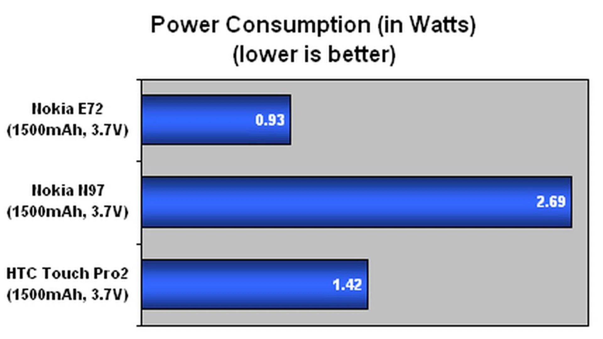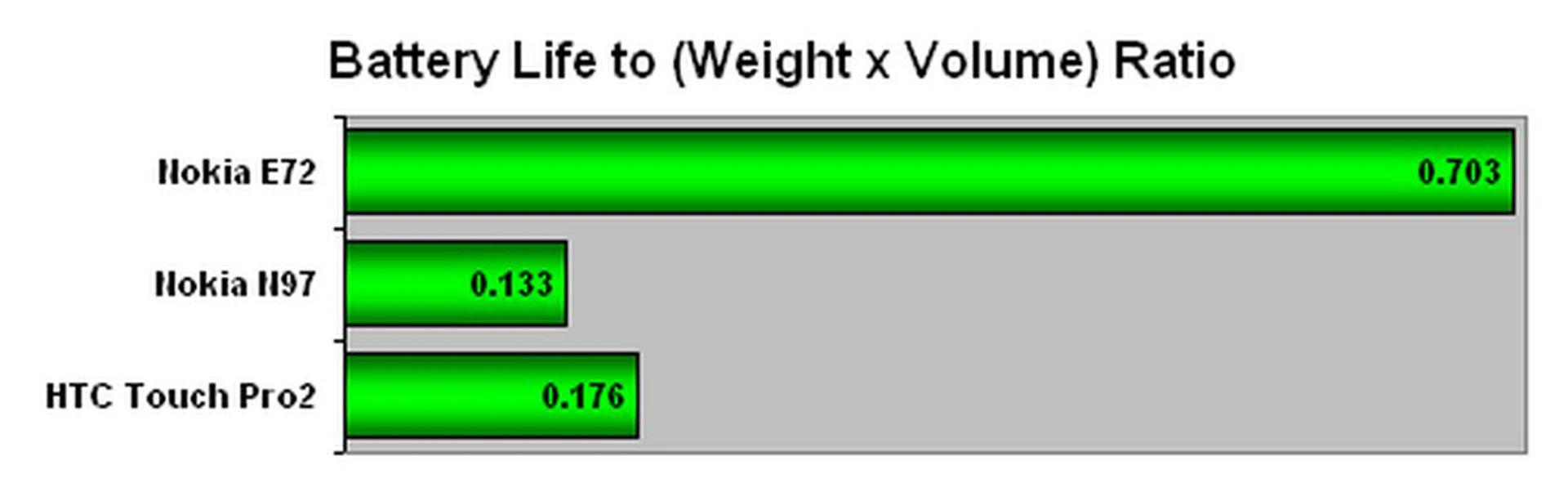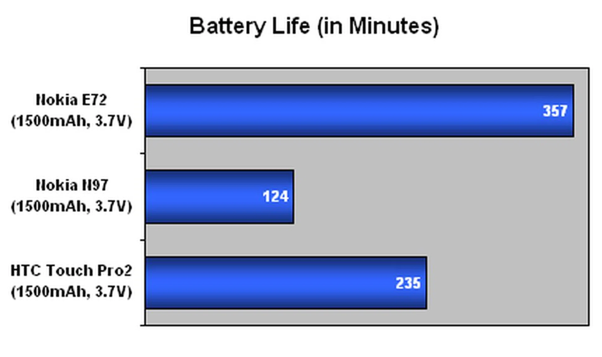 Looking across Nokia's Symbian lineup, we noticed that the E72, which is based on the Symbian S60 3rd Edition OS, has lived up to its predecessor's fame at battery mileage. At nearly the six hour mark, the E72 finally put itself to sleep and proved its capability as a device of great stamina. Against the HTC Touch Pro2 with a similar battery capacity, it's not surprising that the E72 will have the advantage. But forget not that the E72 is running at a lower screen resolution and has a smaller screen, both of which would directly aid in its power efficiency.