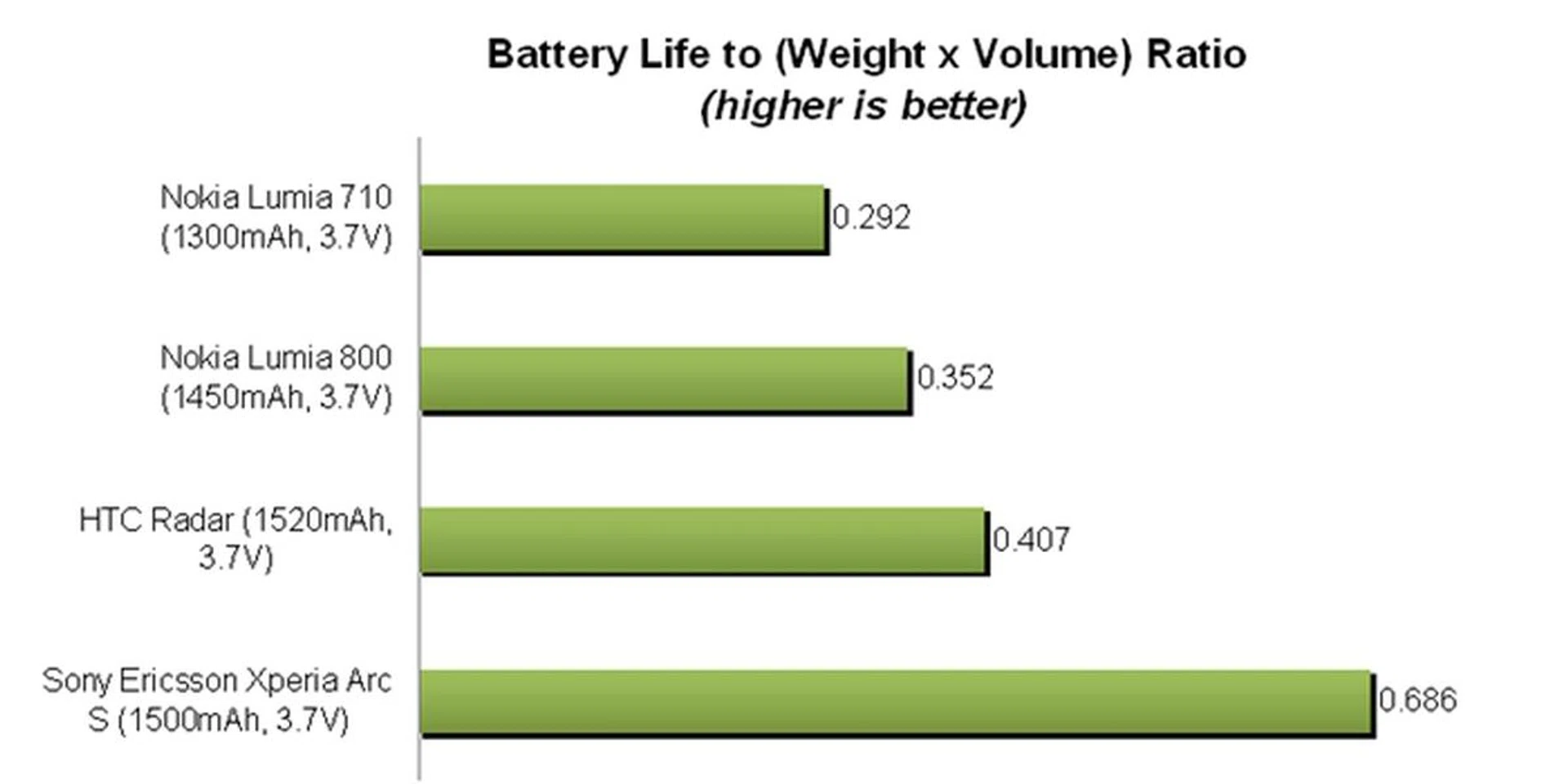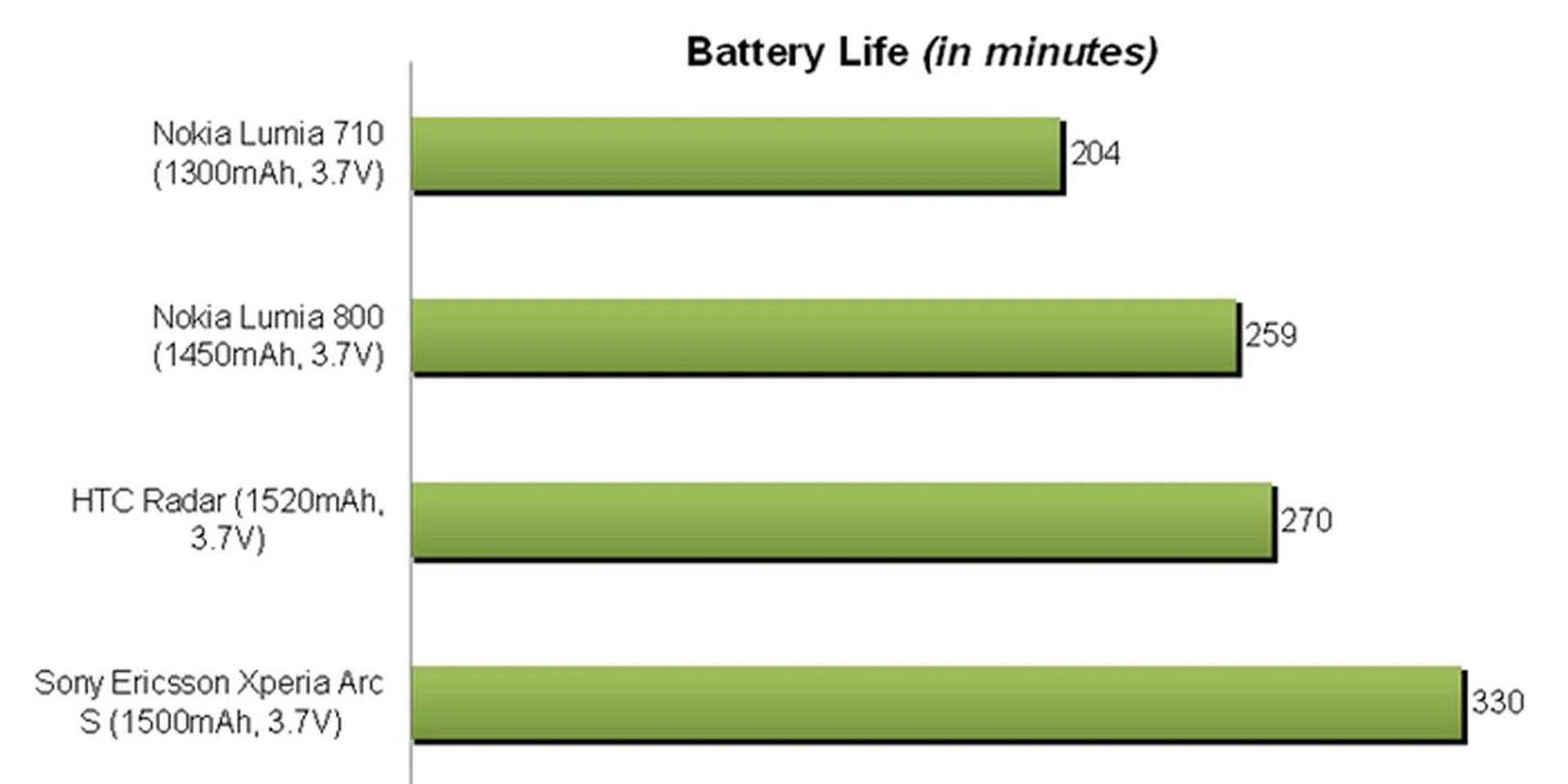 Not surprisingly, the Lumia 710 faltered badly in the battery test by registering the lowest battery mileage. It only clocked 204 minutes on a single full charge, which is close to an hour shorter battery lifespan compared to the Lumia 800. Although both devices have the same screen size and processors, the Lumia 800 had a better performance thanks to a slightly larger battery capacity and more power-efficient AMOLED display. Never mind the efficient AMOLED display, if you look at the HTC Radar's S-LCD implementation and registering even higher battery performance even though it has a larger battery capacity and screen size, the Lumia 710 pales in comparison.
