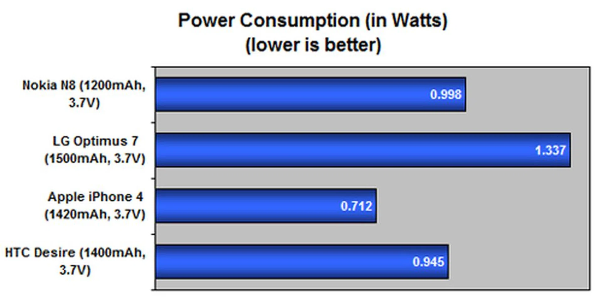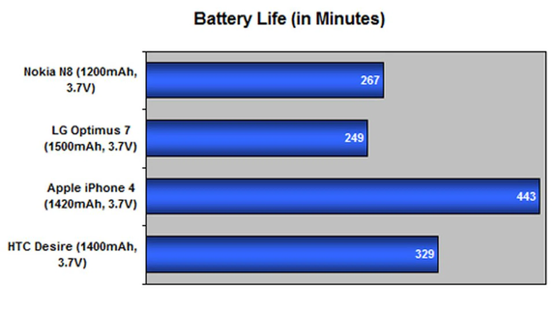 With a 1200mAh battery, the N8 lasted close to 4 hours 27 minutes. We see this as an average number, which should have been higher given the fact that it is using a smaller OLED screen compared to those within the comparison chart. Matching up against the Desire with similar weight and dimensions, the lower mileage from the N8 puts it at a disadvantage on the portability scale, with only the Optimus 7 scoring lower due to its less efficient power management. Compared to the previous flagship, , the N8 fares a lot better, but competition has since stiffened up quite a bit as well.