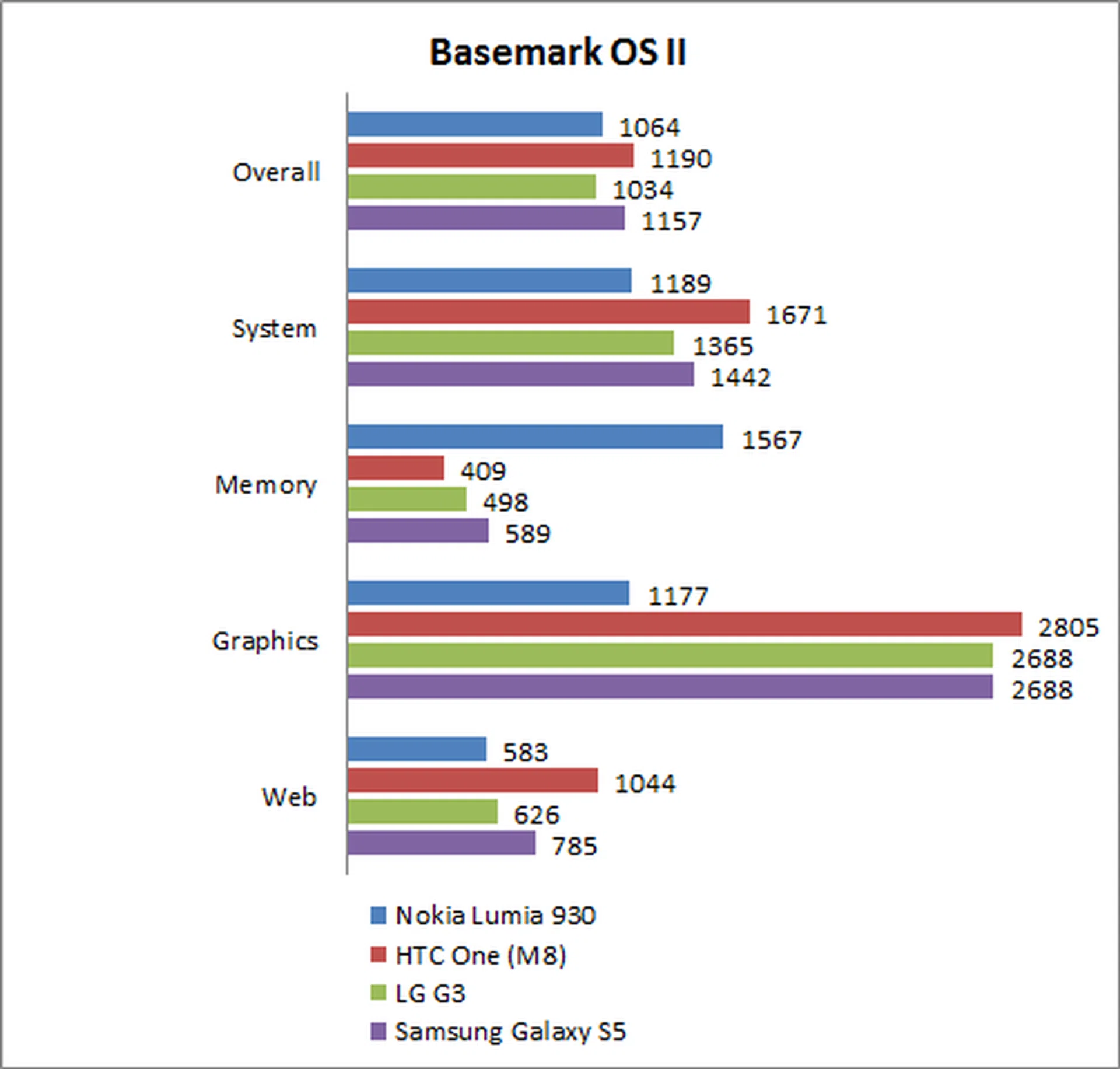 Basemark OS II is a cross-platform suite of synthetic tests designed to stress the whole platform at a variety of workloads. Overall, the Lumia 930 didn't perform badly here, doing especially well on the memory test. However, the Windows Phone 8.1 OS seems to be quite poor in the graphics department, scoring vastly lower than all three Android devices. It's also worth noting that in the Web benchmark, the Lumia 930 actually had the lowest score, contrary to its Sunspider javascript score.