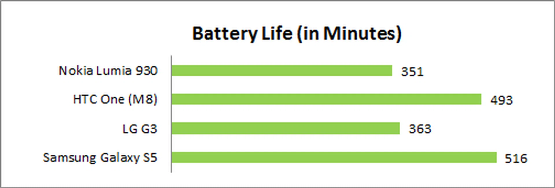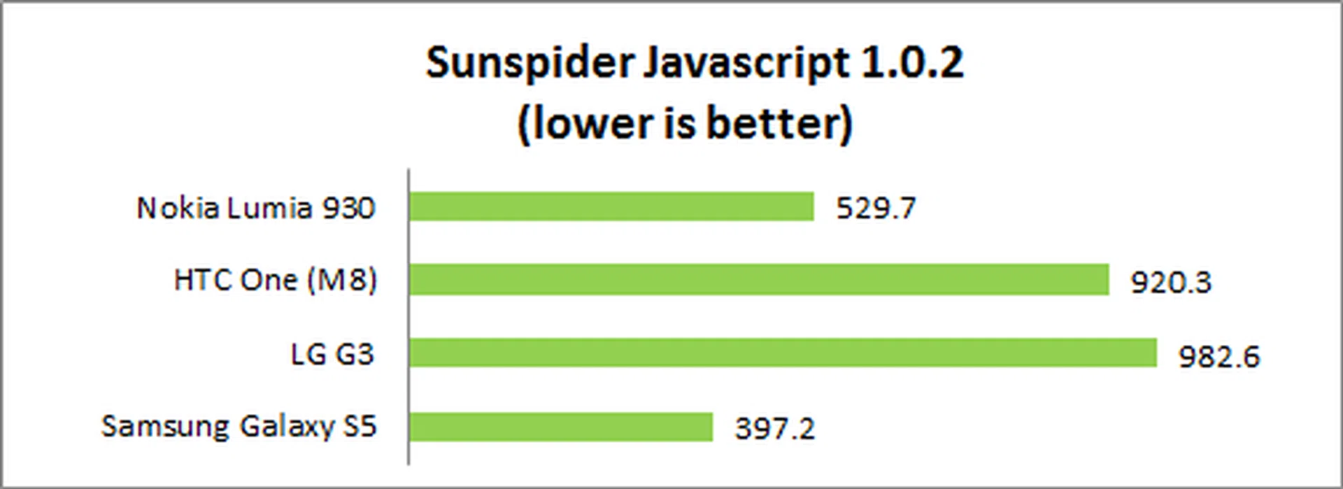 SunSpider Javascript measures the browsing performance of a device. It not only takes into consideration the underlying hardware performance, but also assesses how optimized a particular platform is at delivering a high-speed web browsing experience. Windows Phones have done well in the past with Sunspider, and the Lumia 930 is no exception, losing out only to the Samsung Galaxy S5 (which we suspect is an optimization on Samsung's part). In our usage experience, the Lumia 930 was quite smooth, but didn't seem noticeably better than any of the Android phones tested.