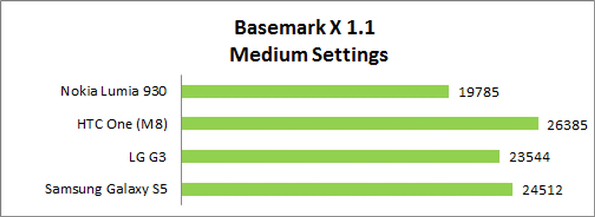Windows Phone 8 is limited to Basemark's medium detail setting, which developer Rightware actually designed specifically to accommodate Microsoft's mobile operating system. It is less demanding than the high detail setting, but remains visually impressive. The Lumia 930 didn't perform as poorly as expected, based on its Graphics score in Basemark OS II, but still scored notably lower than all three Android smartphones.