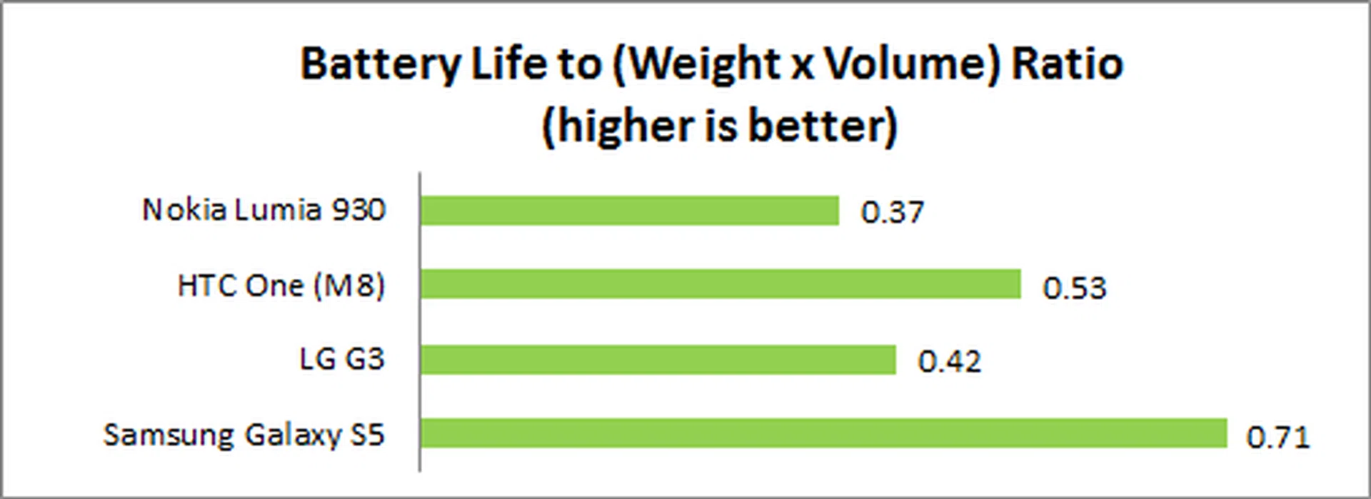 We measure the portability of a device by calculating its battery life to (weight x volume) ratio. The Lumia 930 fared the worst in this test due to its chunky profile, above average weight and low battery life.