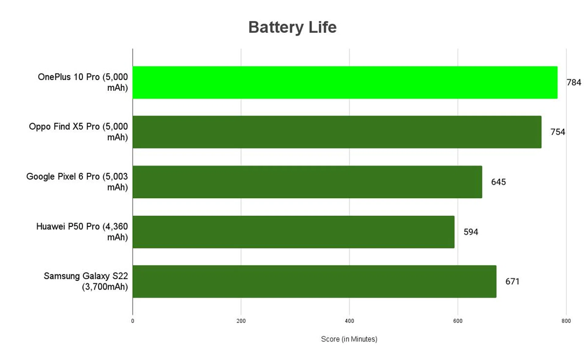 Packing 5,000mAh, the OnePlus 10 Pro was able to deliver 13 hours of continuous uptime. It’s more efficient than many of its competitors, besting more expensive alternatives with the same chipset (Samsung Galaxy S22 Ultra and Oppo Find X5 Pro) and being far more efficient than competitors at the same tier with the same screen size, resolution and capabilities (Google Pixel 6 Pro).