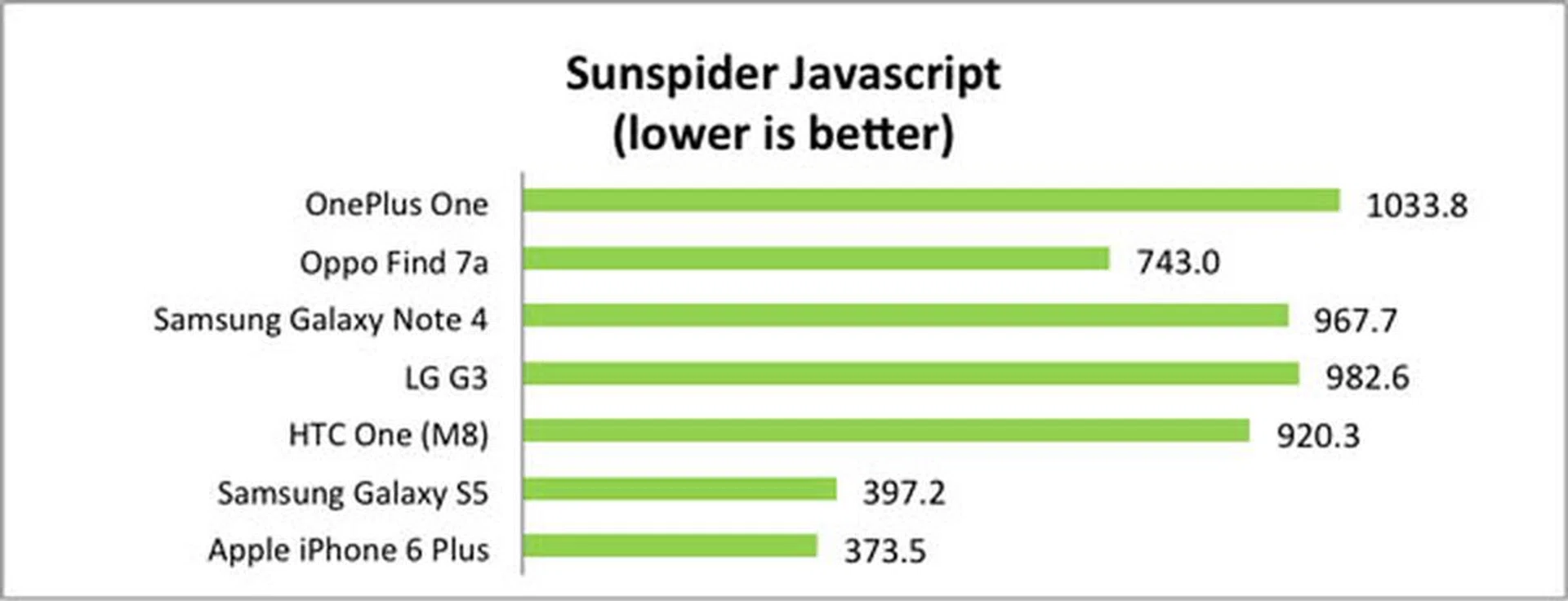 For the OnePlus One, the Sunspisder performance is notoriously bad compared against its competitors. One possible reason is that for the OnePlus One, the Sunspider benchmark was executed via Chrome, which usually yields poorer Sunspider scores compared to a native Android browser.