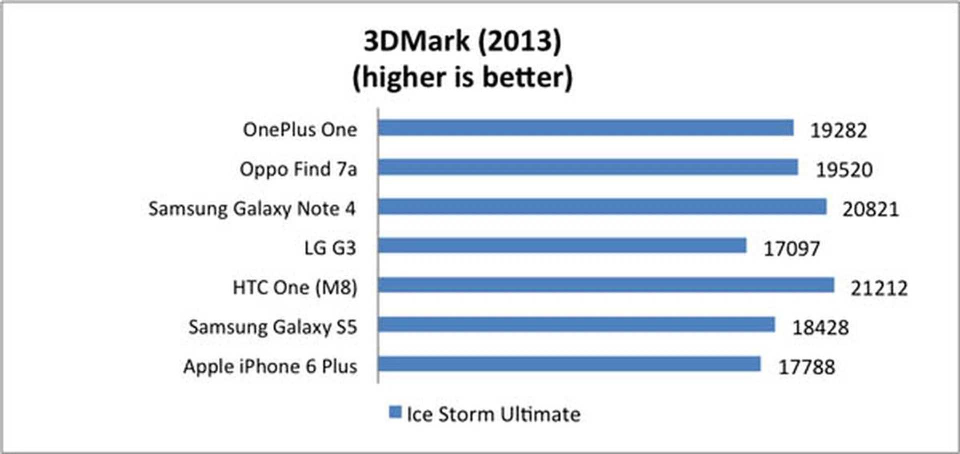 Despite its low price, the 3DMark score of the OnePlus One is easily one of the higher ranking results. Given that the phone specifications of the OnePlus One is close to Samsung's Galaxy S5, it's able to outperform it. The scores are in fact fairly close to that of the Samsung Galaxy Note 4, which is powered by the newer Qualcomm Snapdragon 805 processor.