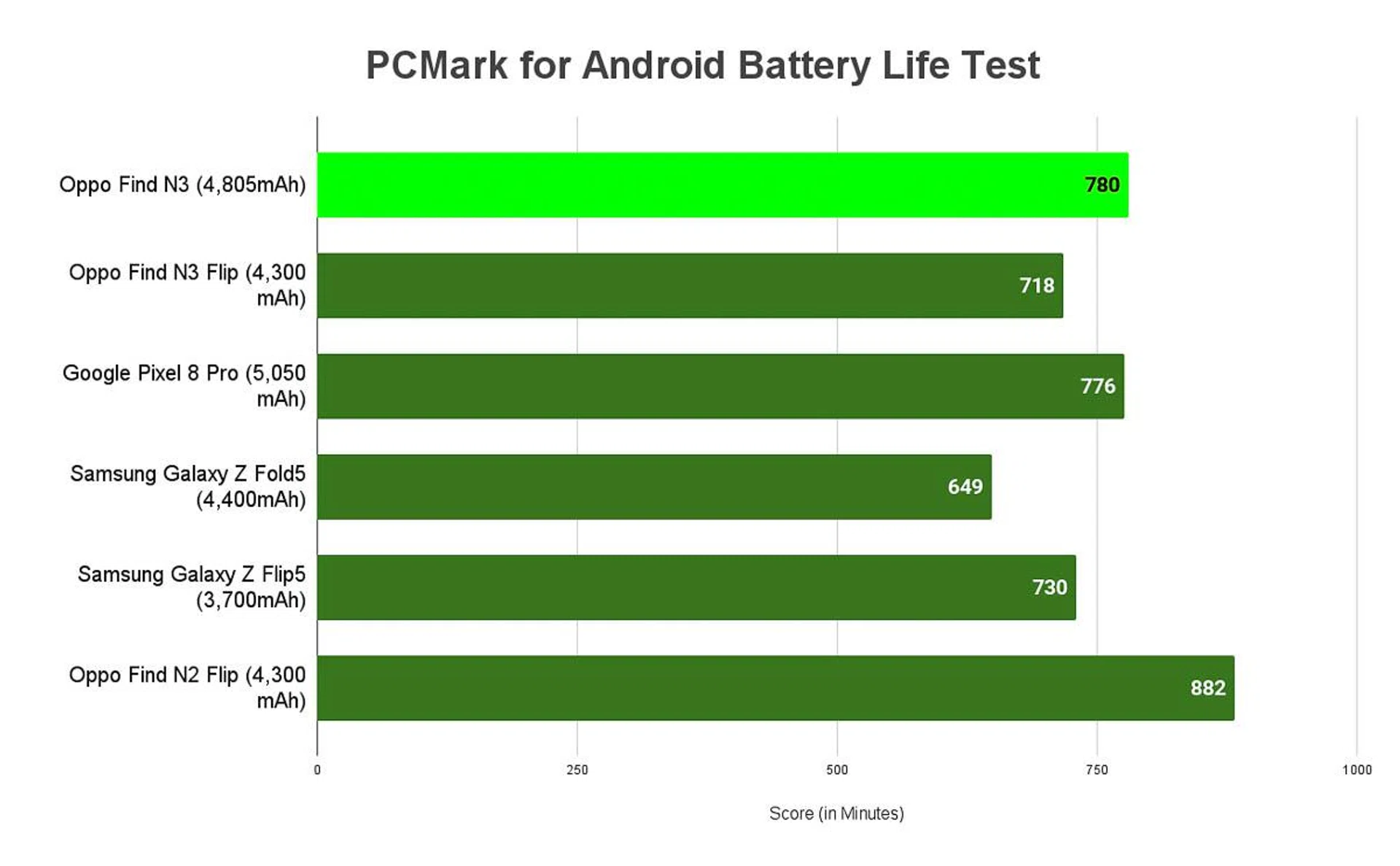 In real-world use, the battery life is absolutely great. The Oppo Find N3 uses about 10% while idling for 24 hours with occasional notifications, about 10% for an hour of photography and 15% for 60Hz gaming at max brightness. Over a day of using the phone both with the Cover Screen and the internal screen, it consumed just under 60% battery with moderate use watching videos, scrolling through social media and browsing the web.