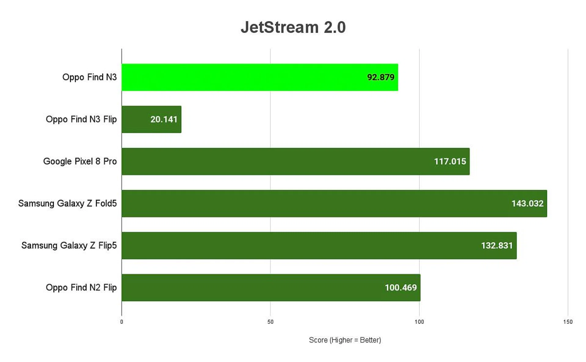 The Jetstream benchmark seemed an anomaly until we noticed that the Oppo Find N3 Flip also had very low scores. However, trying other web browsers for the tests brought the numbers back up to a more reasonable level compared to the low scores we were getting on Chrome.
