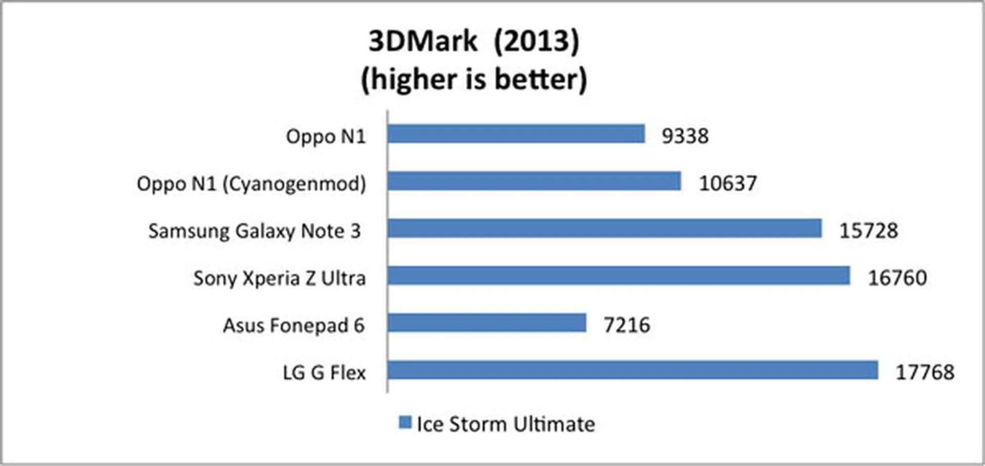 SunSpider Javascript measures the browsing performance of a device. It not only takes into consideration the underlying hardware performance, but also assesses how optimized a particular platform is at delivering a high-speed web browsing experience. Curiously, Oppo N1's performance is one the worst of all the devices. What is interesting is that the Cyanogenmod edition of the Oppo N1 fares worse than its ColorOS version.