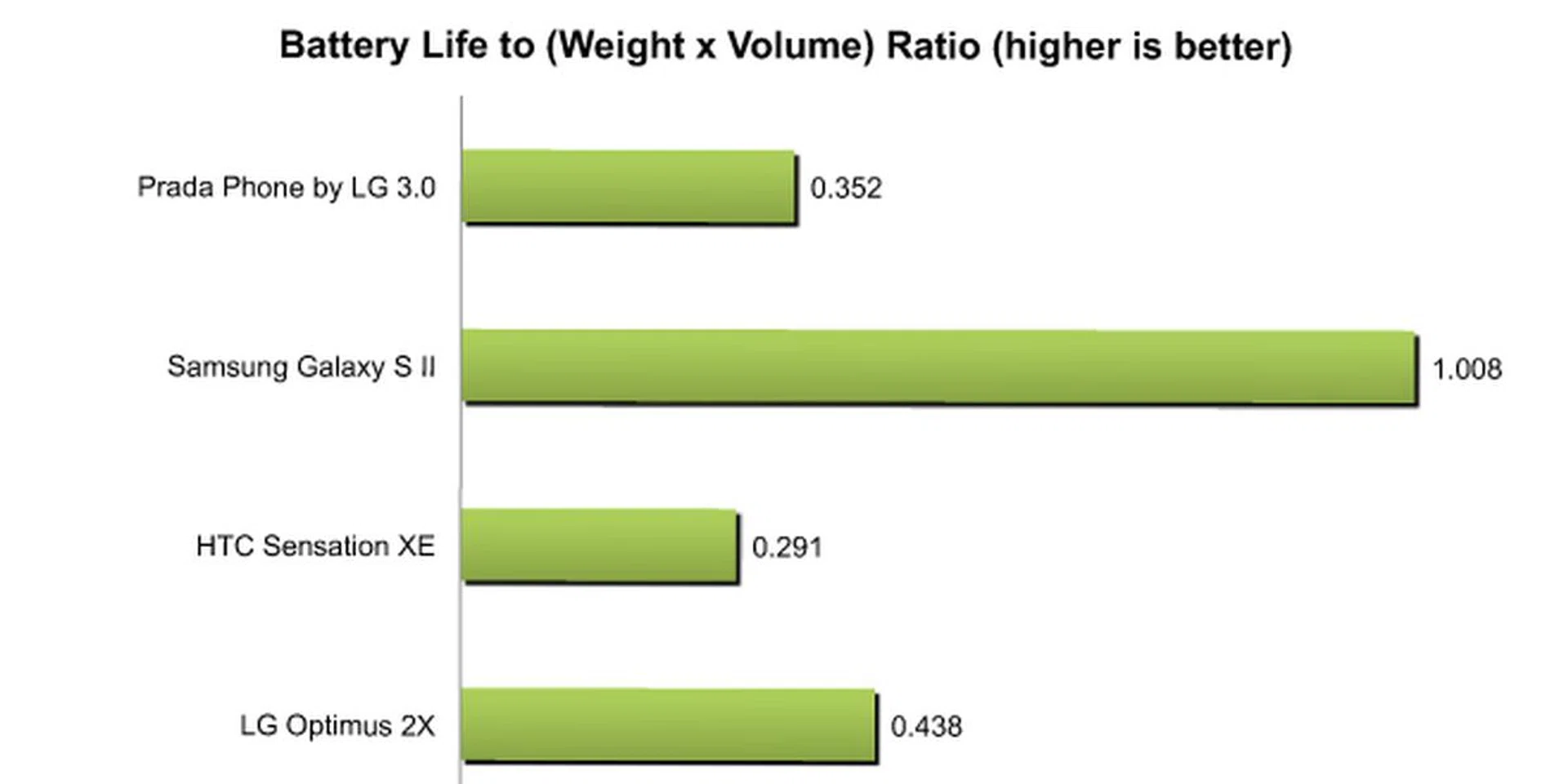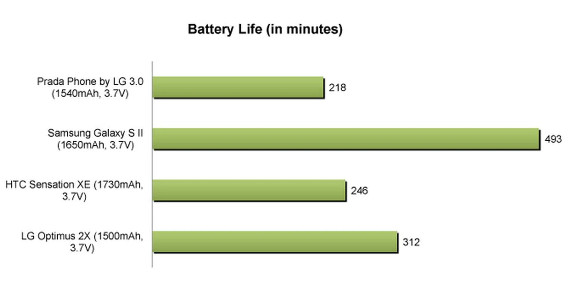 The intensive battery test didn't let the Prada phone off easily, with a below average timing of 218 minutes for its 1540mAh battery. It didn’t fare too badly on the portability index thanks to its slim profile, though it’s far from being the most portable device out there. On a daily basis, we did manage to squeeze nearly a day’s worth of usage out of the Prada phone, though this was possible with minimal data services being engaged.