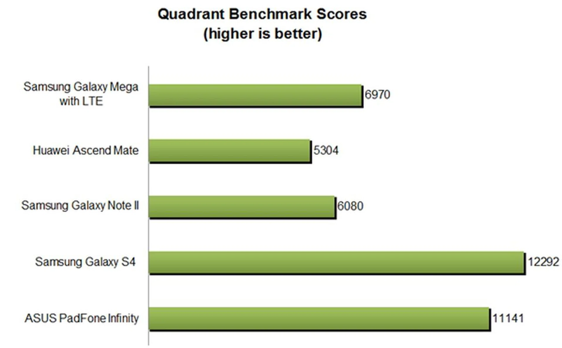 Since this is the first time a Snapdragon 400-powered device with an unorthodox 1.5GB RAM arrived in our labs, we are eager to see how the Galaxy Mega fares against the competition in the Quadrant benchmark. The test evaluates CPU, memory, I/O and 3D graphics of Android devices. In this comparison, we pit the Galaxy Mega against the Huawei Ascend Mate and Galaxy Note II. The Galaxy S4 and PadFone Infinity are included on the sideline as they are the latest 5-inch phones to enter the market.