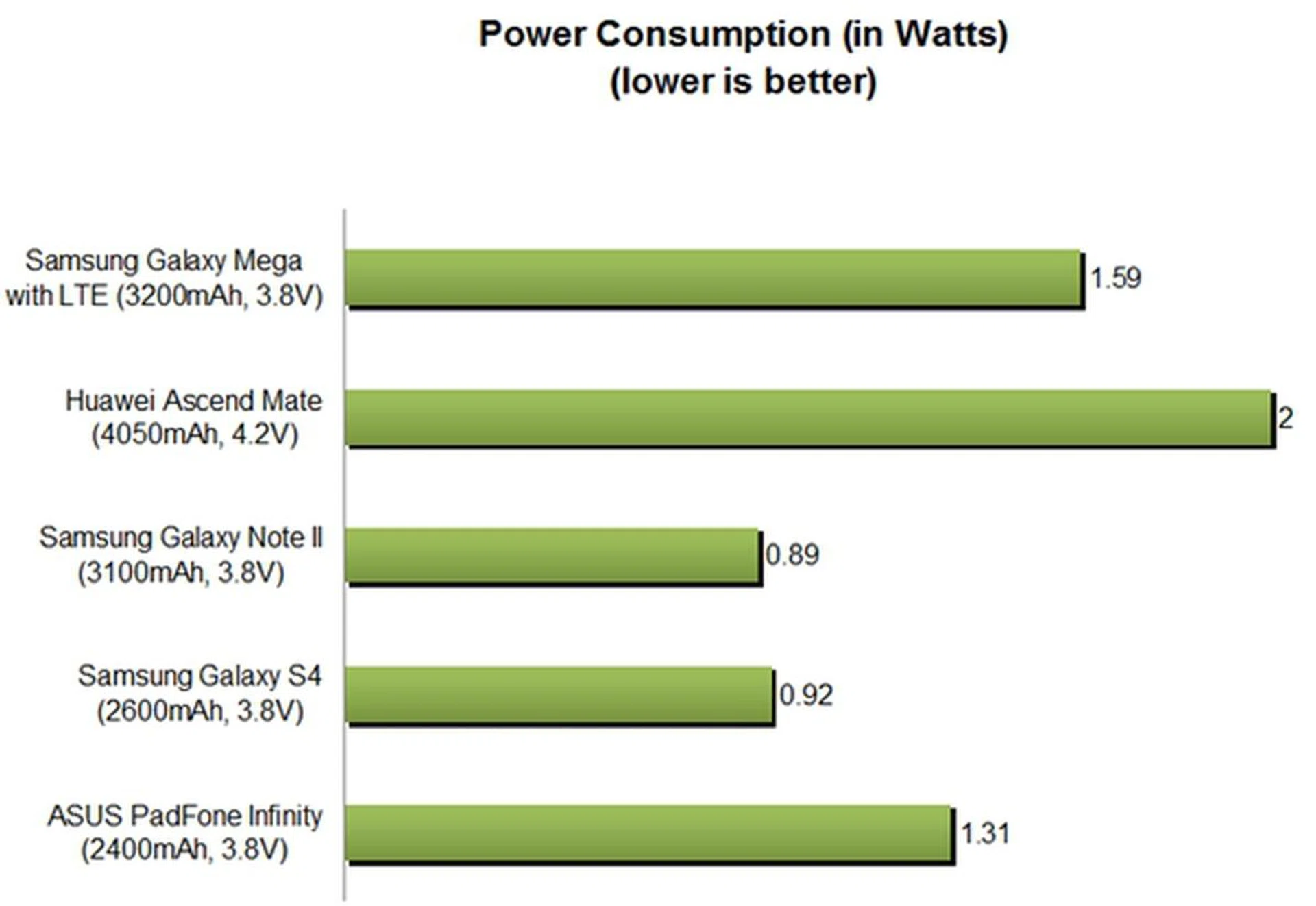 Having the biggest display ever on a phone has its drawbacks too. The Galaxy Mega has one of the highest power consumption at 1.59W but it managed to keep a step or two behind the Ascend Mate. The Galaxy Note II and Galaxy S4 drew the least power among the phones compared due to their AMOLED displays, which are power-efficient by nature.