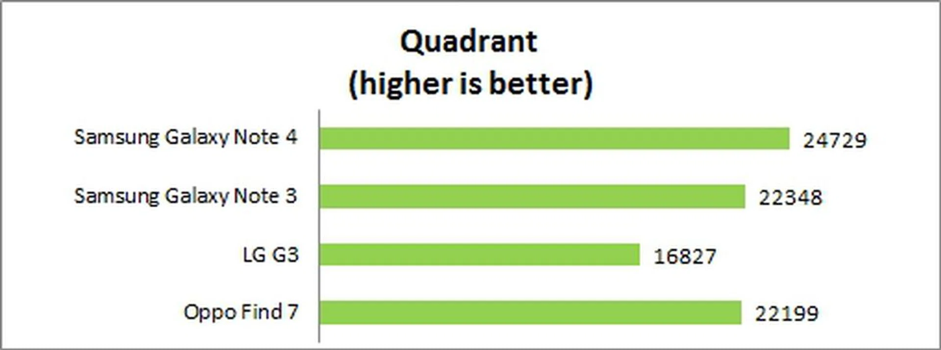 Quadrant evaluates a device's CPU, memory, I/O and 3D graphics performance. The Note 4 fared 11% better than the Note 3 and Find 7 in the Quadrant benchmark, while pulling a 47% lead over the G3.