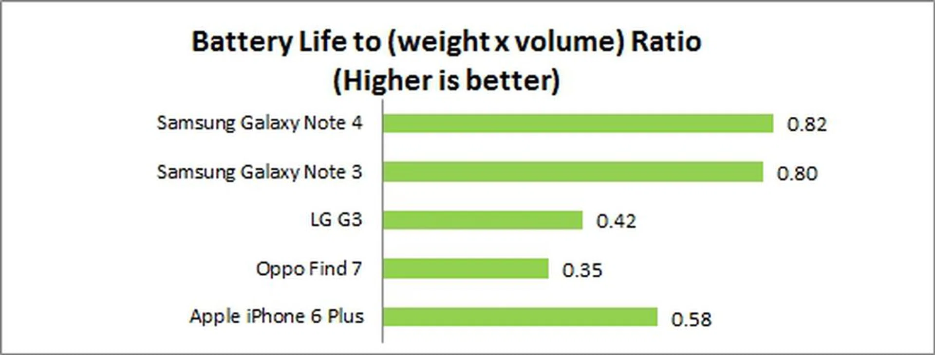 We measure the portability of a device by calculating its battery life to (weight x volume) ratio. Despite the Note 4 being the heaviest of the lot, it managed to pull ahead of the pack and edged out the Note 3 in the Portability Index. Its excellent battery mileage more than made up for its heft and form factor.